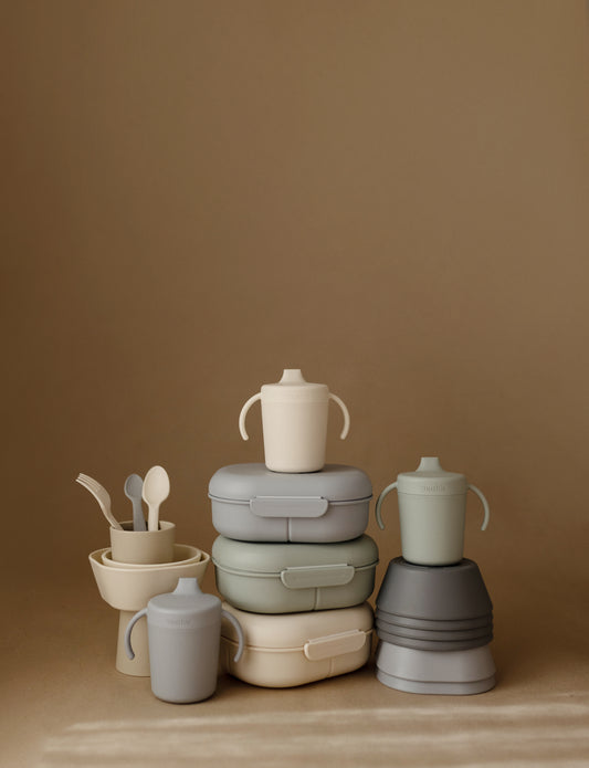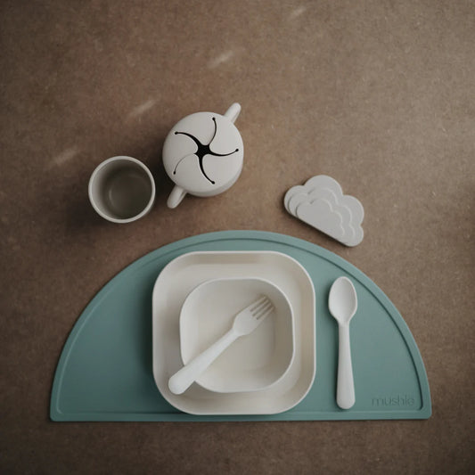 Mushie, Toddler Silicone Spoon Set 2pcs, Cambridge Blue/Shifting Sand