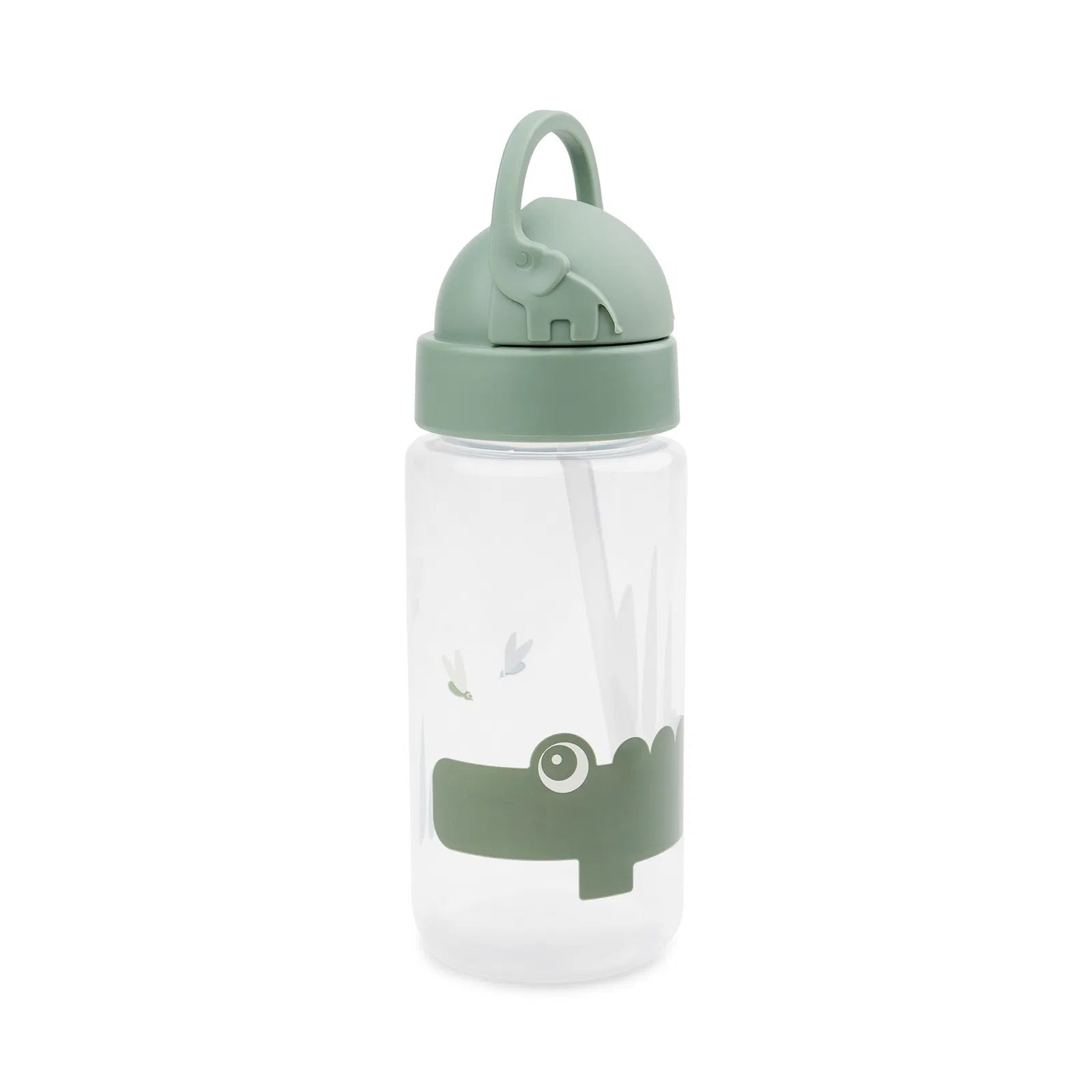 Our Kroko crocodile and flies decorate the water bottle in shades of green.