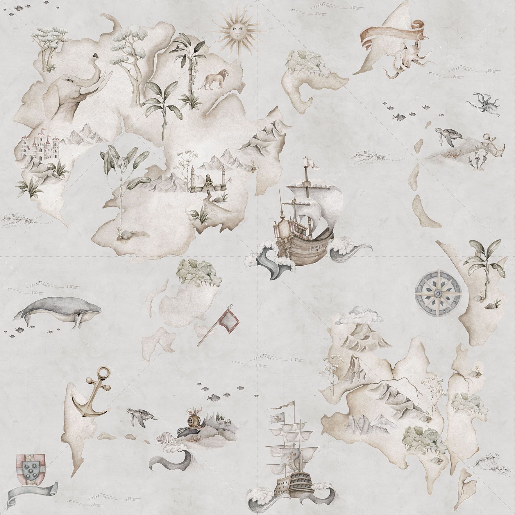 We were inspired by old book illustrations we bought in... Sicily. From the illustrations of the time when people discovered new lands, and those unknown corners of the world must have seemed to them full of strange creatures and treasures. So is the map we created. It has elephants, octopuses, volcanic islands, forts and palm trees. This map is the perfect bedtime story for a little traveler and conqueror.