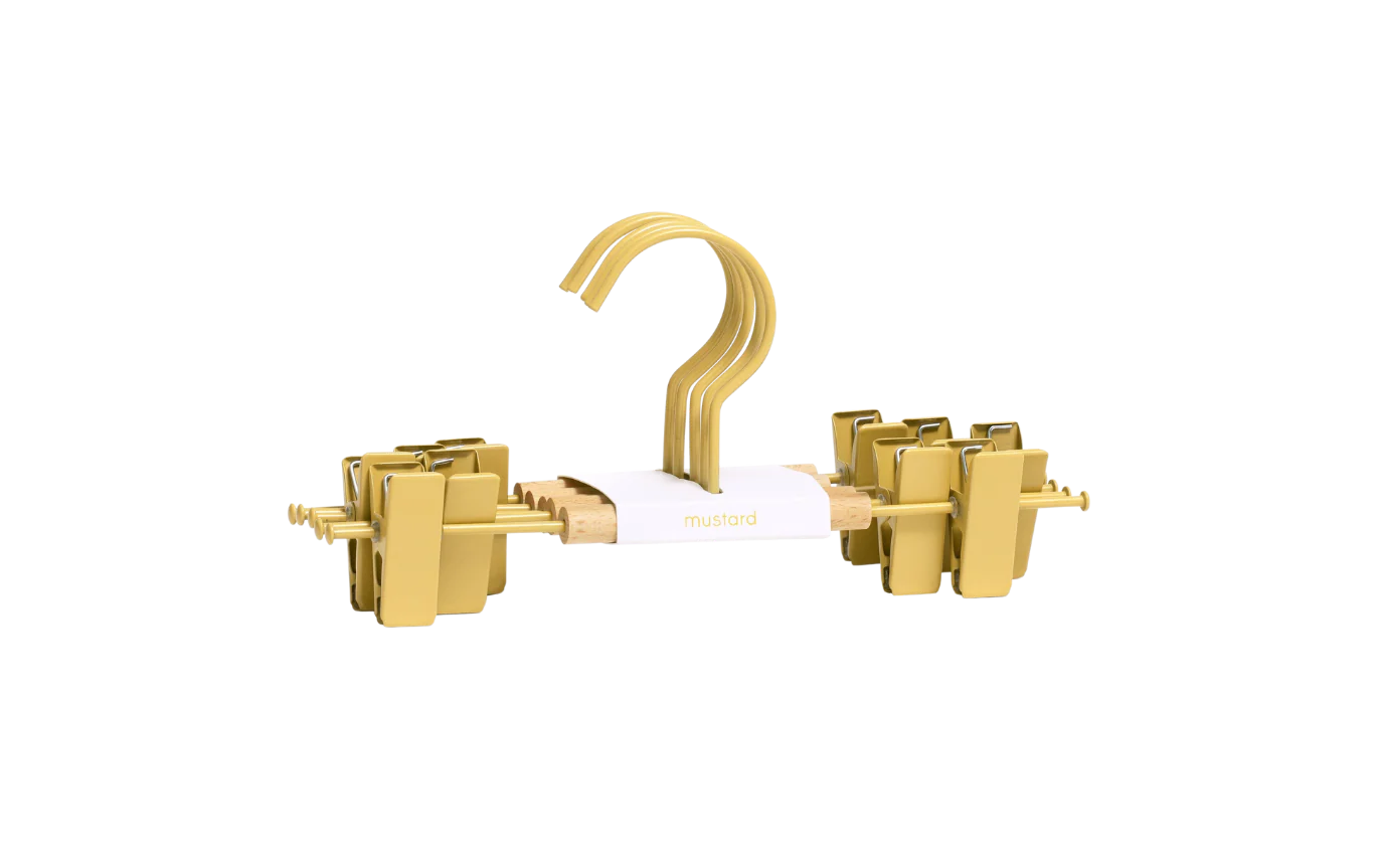 The cutest kids' hangers ever! Mustard Made hangers are sized for kids' clothes and make it easy to organize and find your child's clothes. The two clips keep the clothes in place, and the matte finish and wooden detail are really stylish.