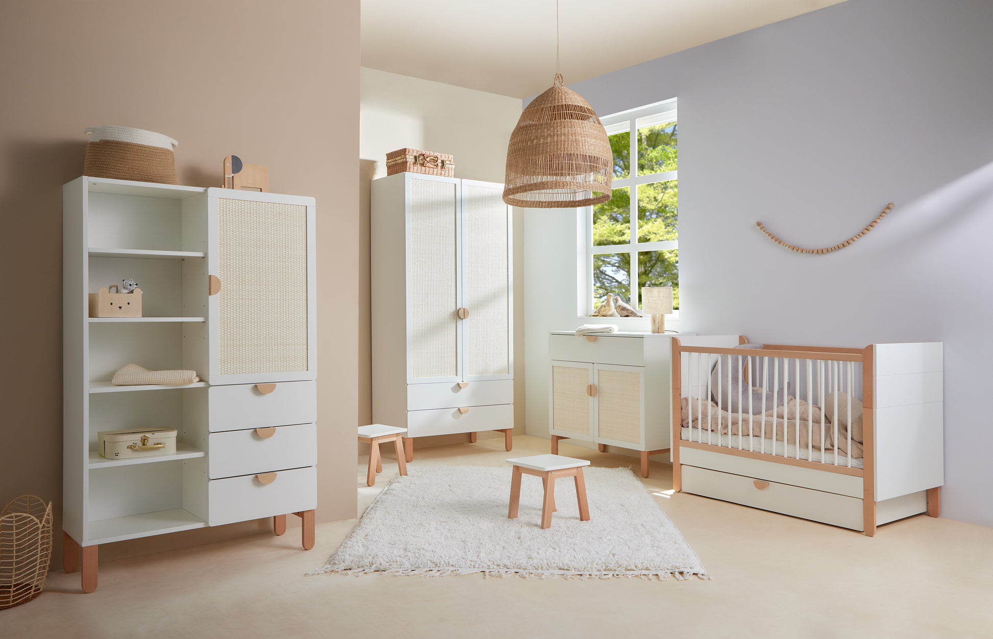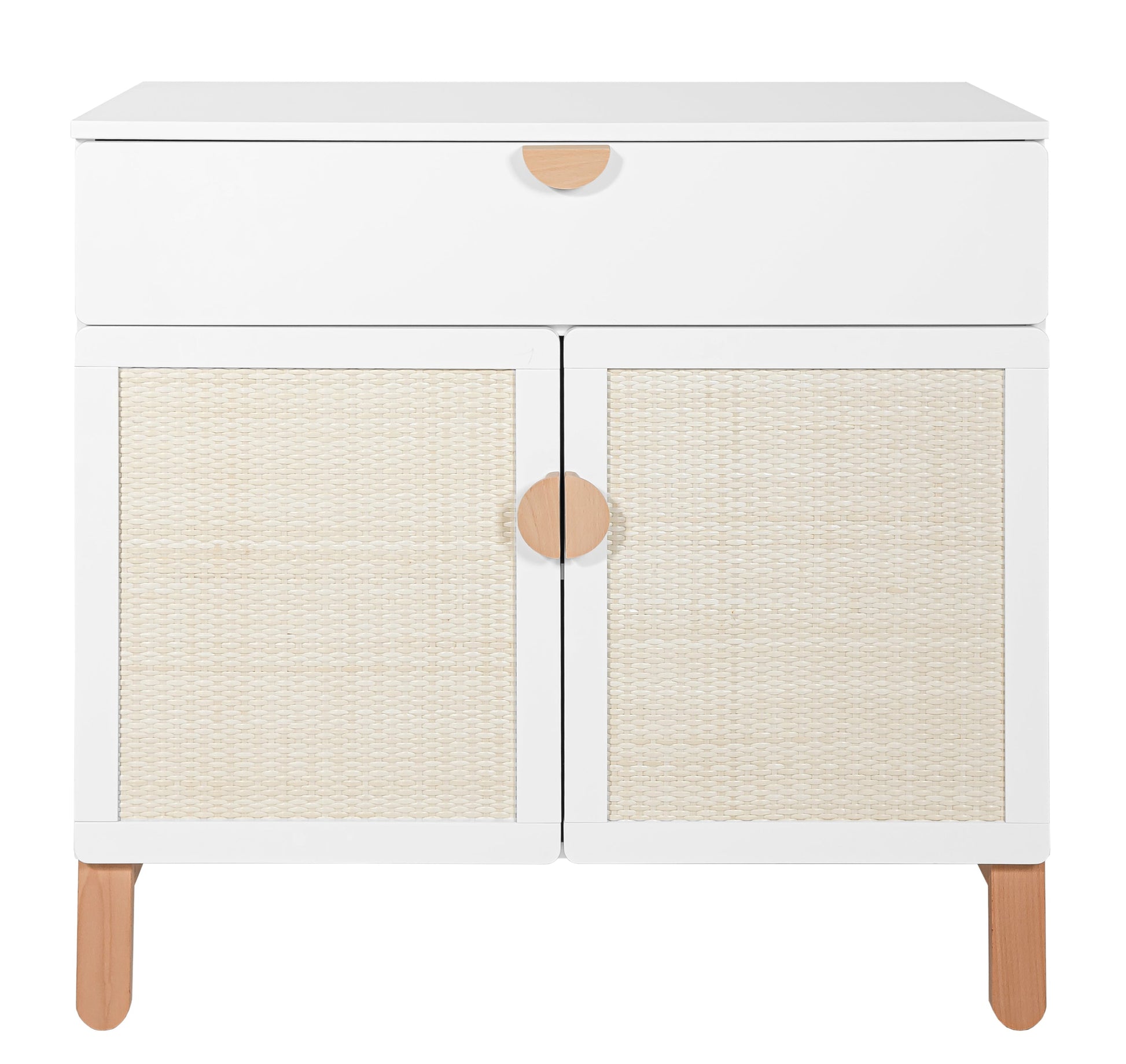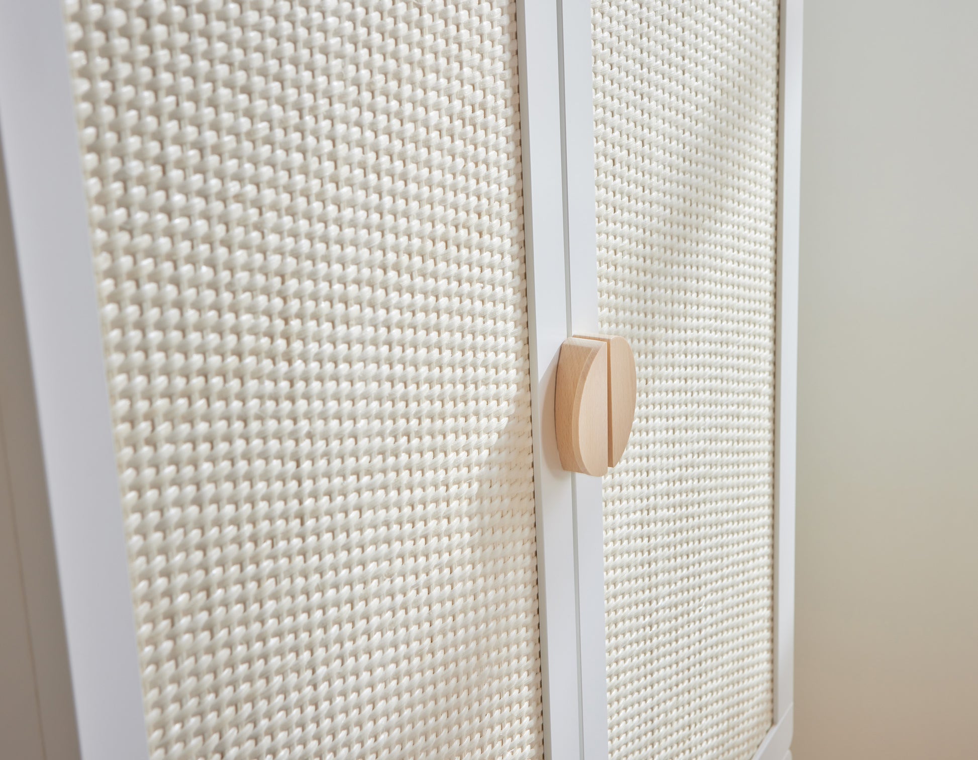 A charming chest of drawers decorated with rattan braids brings a warm and inviting atmosphere to the children's room. All doors and drawers have soft-close closure, thanks to which the doors and drawers always close softly.