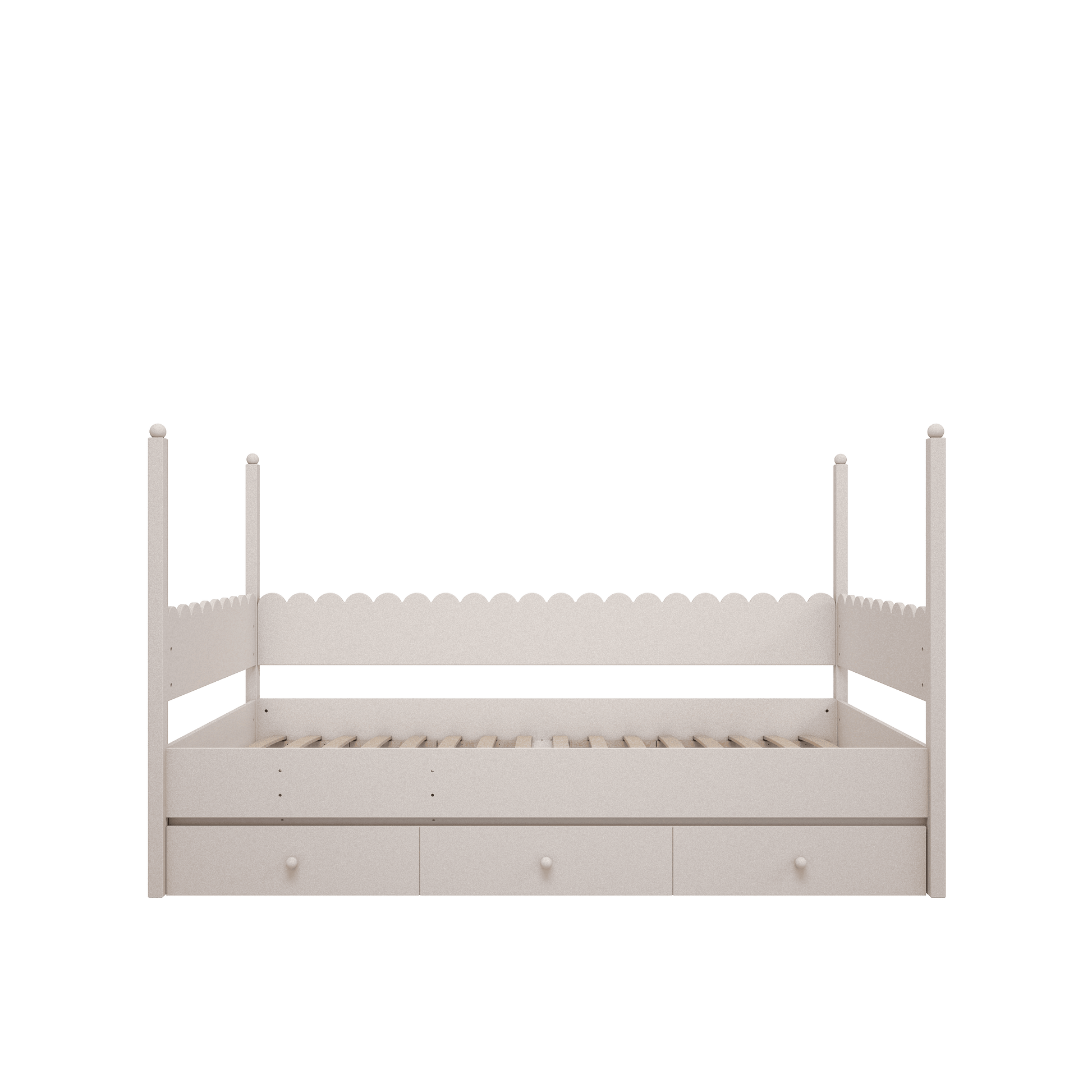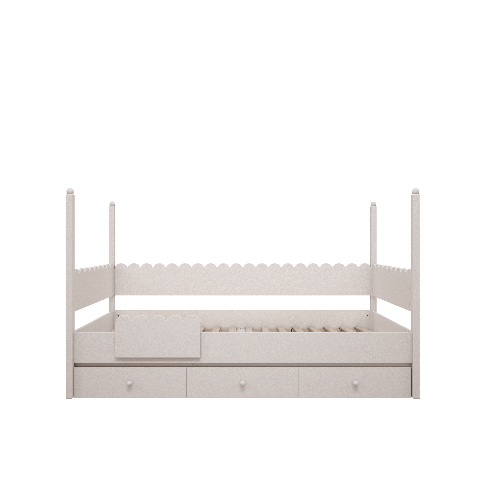 The bed has a durable slatted base for good ventilation and a comfortable sleep. It comes with a spacious underbed box that serves as both extra space and a third bed – perfect for overnight guests or everyday needs. The cute safety rail provides safety for smaller children and can be easily removed later.