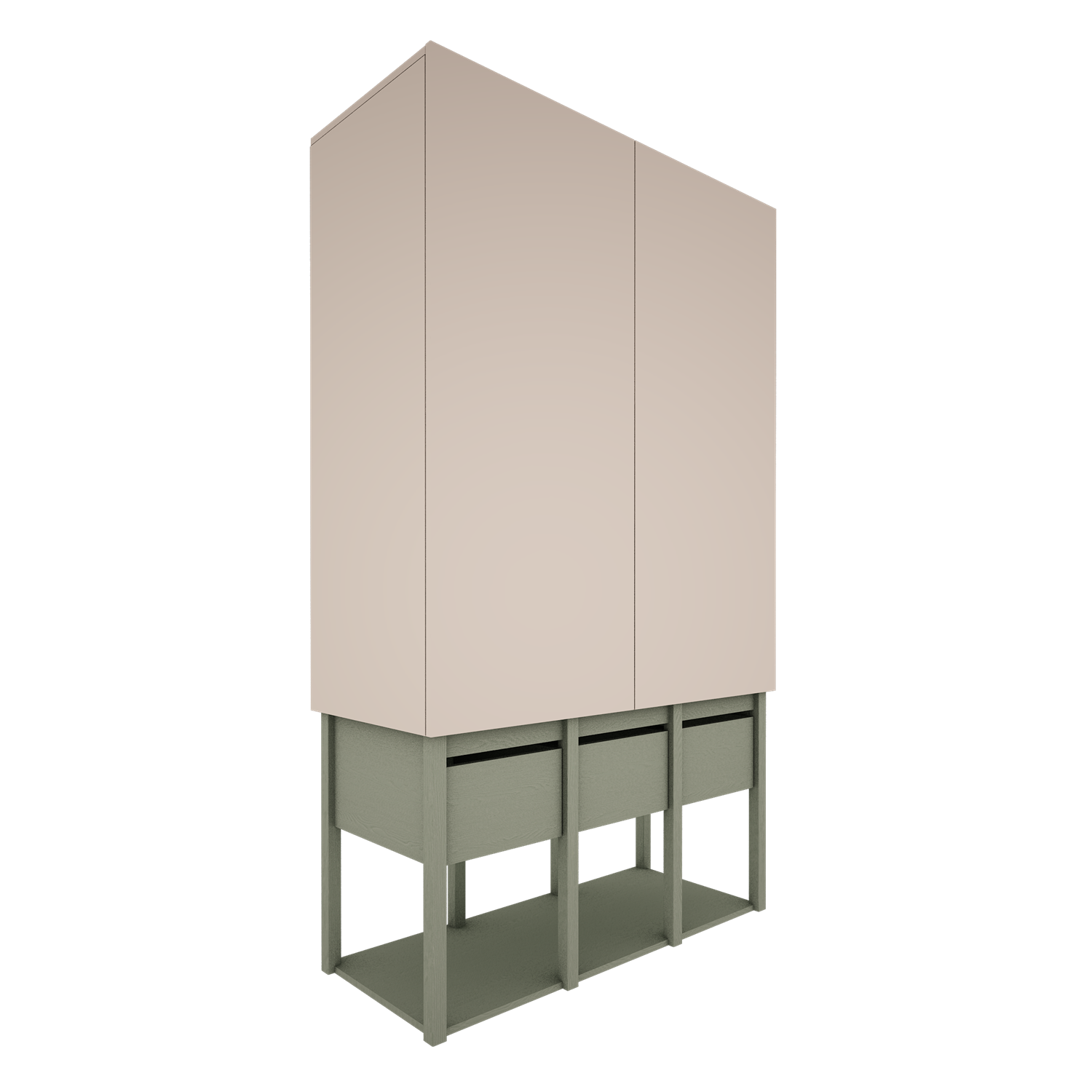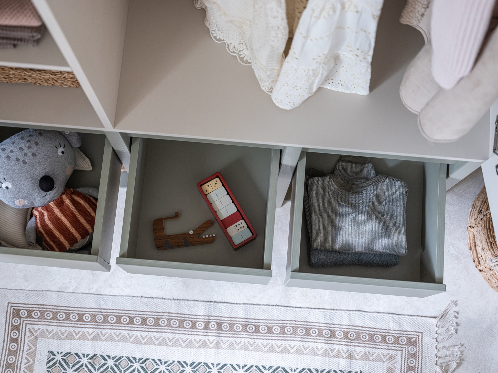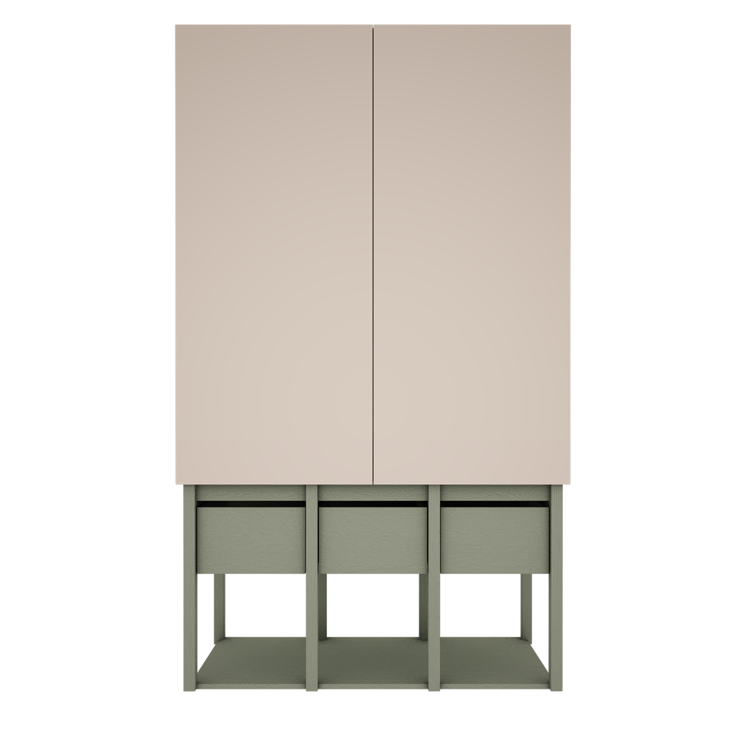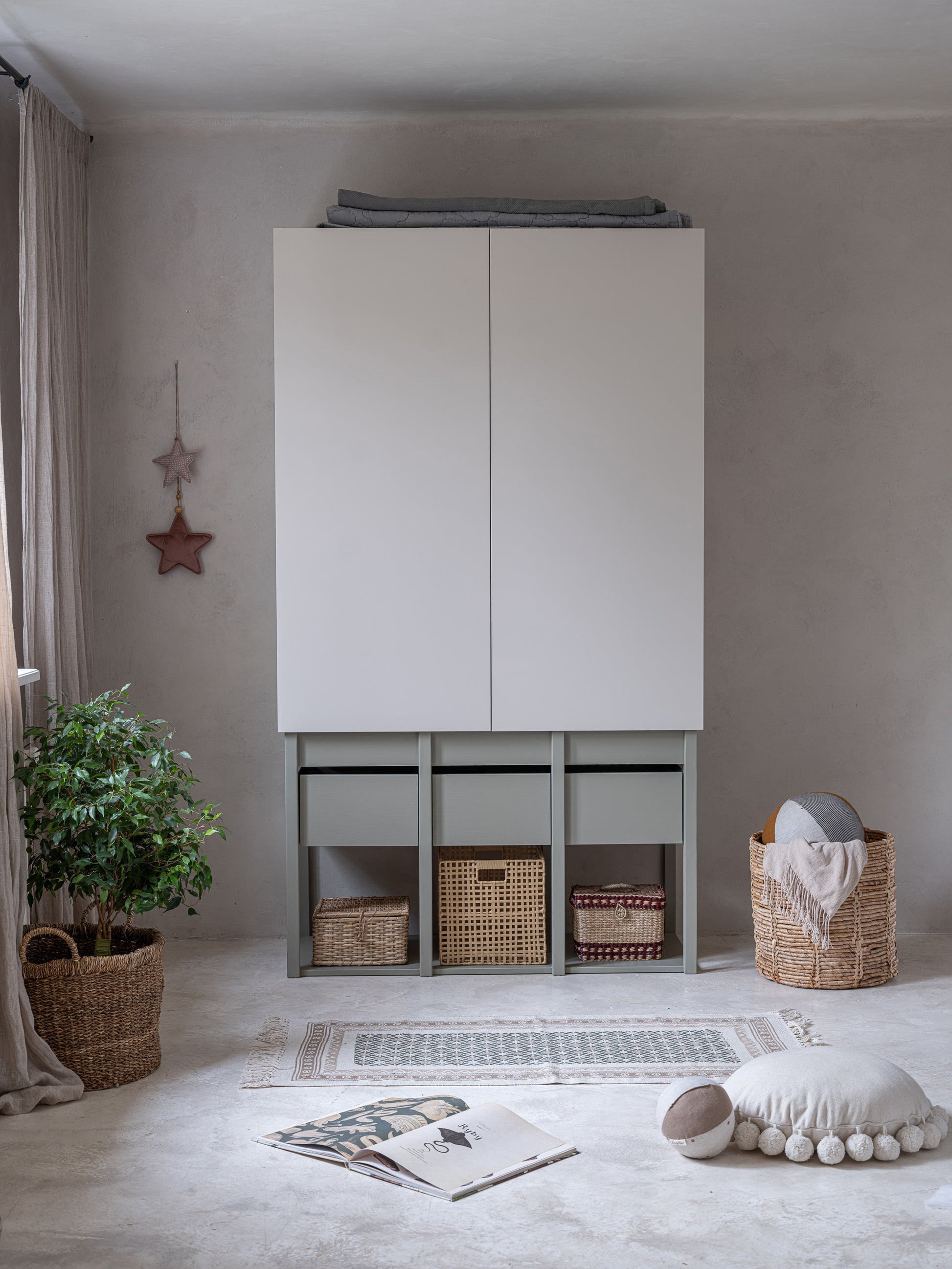 The wardrobe is specially designed for storing children's things, such as toys and Lego blocks. The lower part of the cabinet is made of high-quality pine and the upper part is made of durable MDF, which ensures the longevity of the product. The eucalyptus green lower part brings freshness and fits many interiors, while the sand beige upper part creates a warm atmosphere.