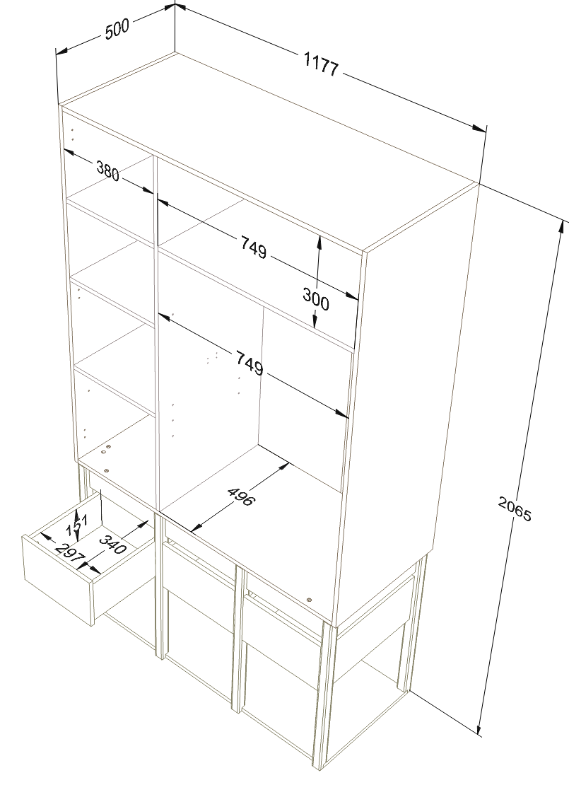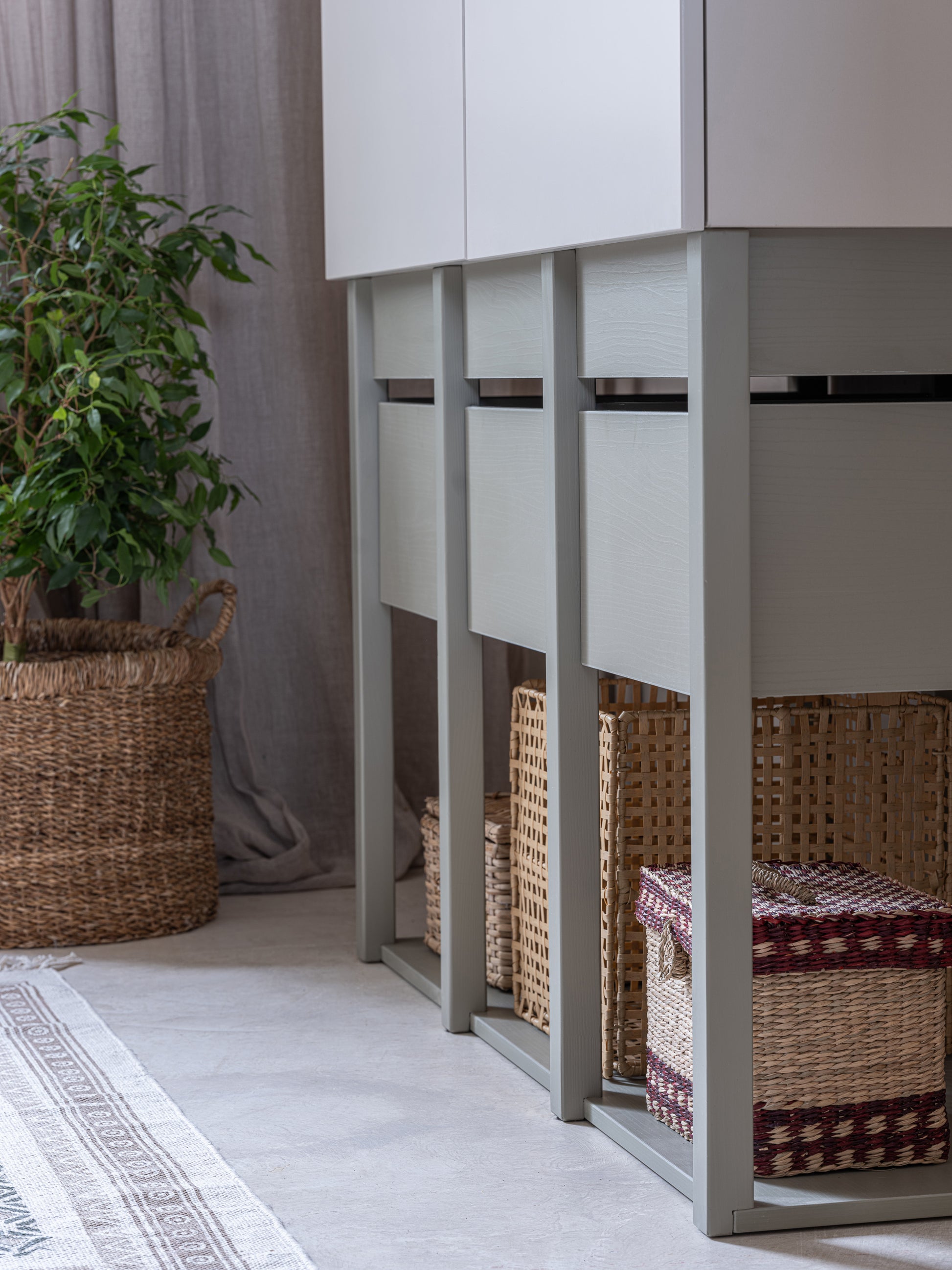 The cabinet has three soft-closing drawers and space for three storage baskets on the lower level. The wider part has a clothes rail, and there are also five shelves for organizing clothes and accessories.