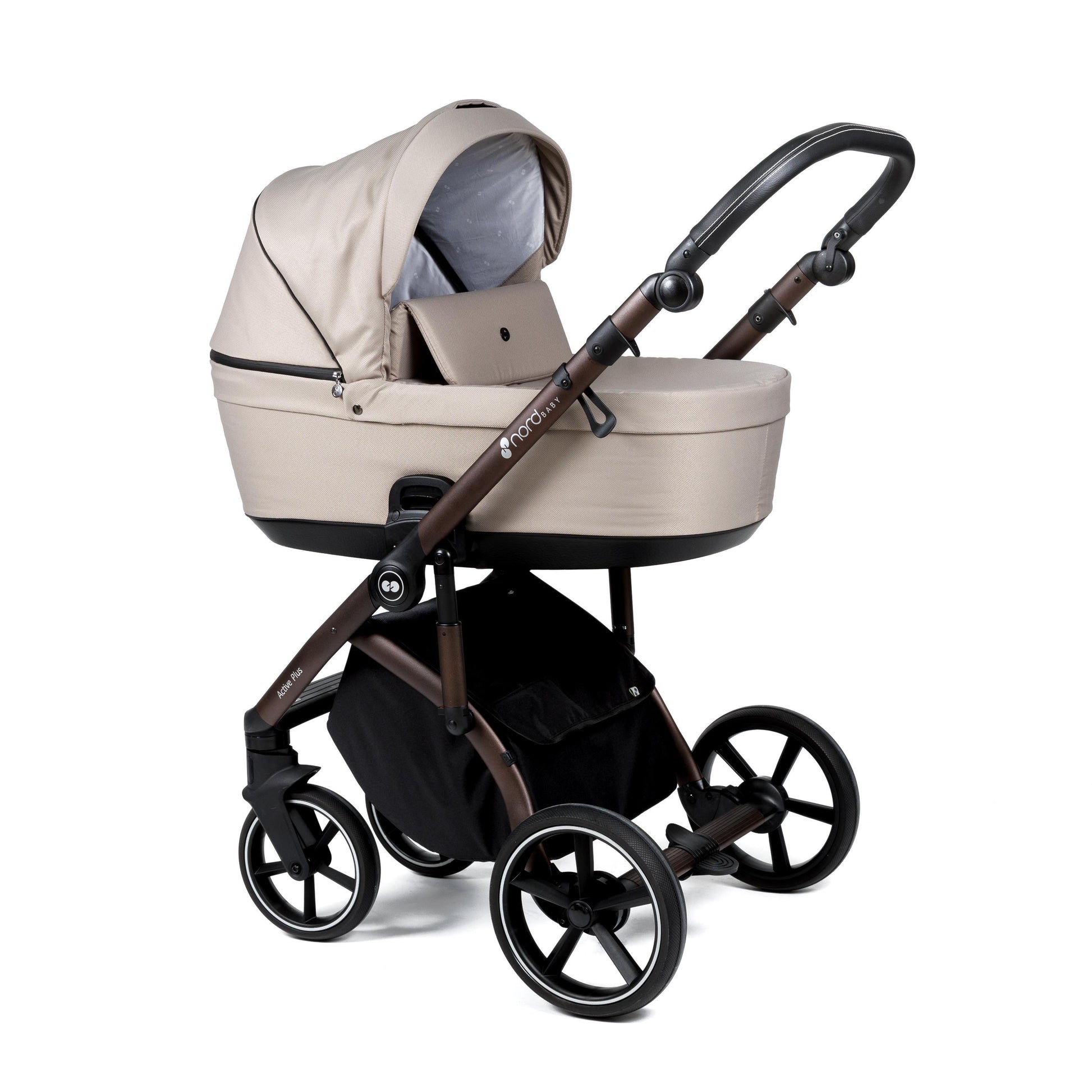 Nordbaby Active Plus -yhdistelmävaunut tarjoavat sujuvan ajokokemuksen lisäiskunvaimennusjärjestelmän ansiosta. Tämä tekee niistä ihanteellisen valinnan nykyaikaisille ja aktiivisille vanhemmille vuoden ympäri.