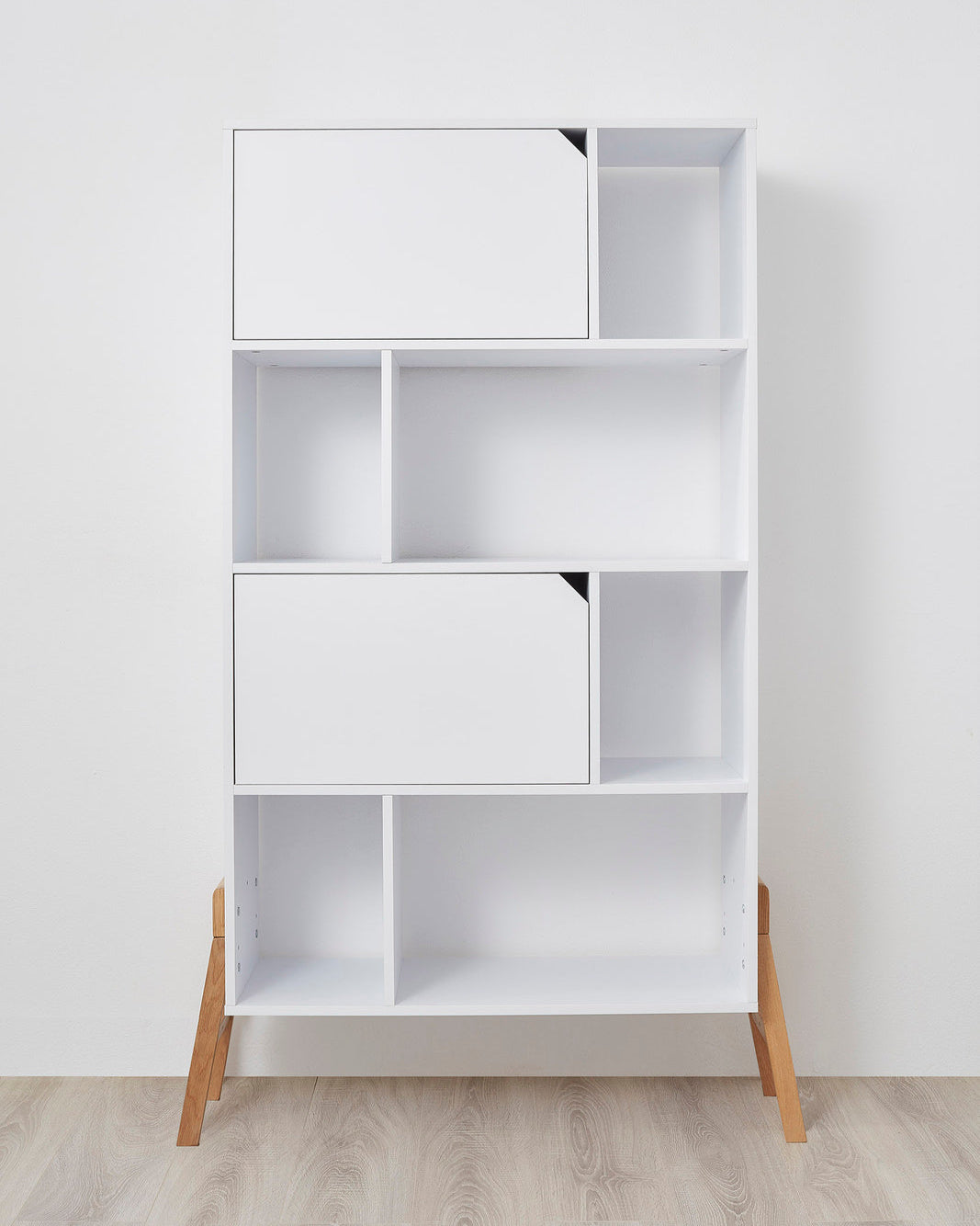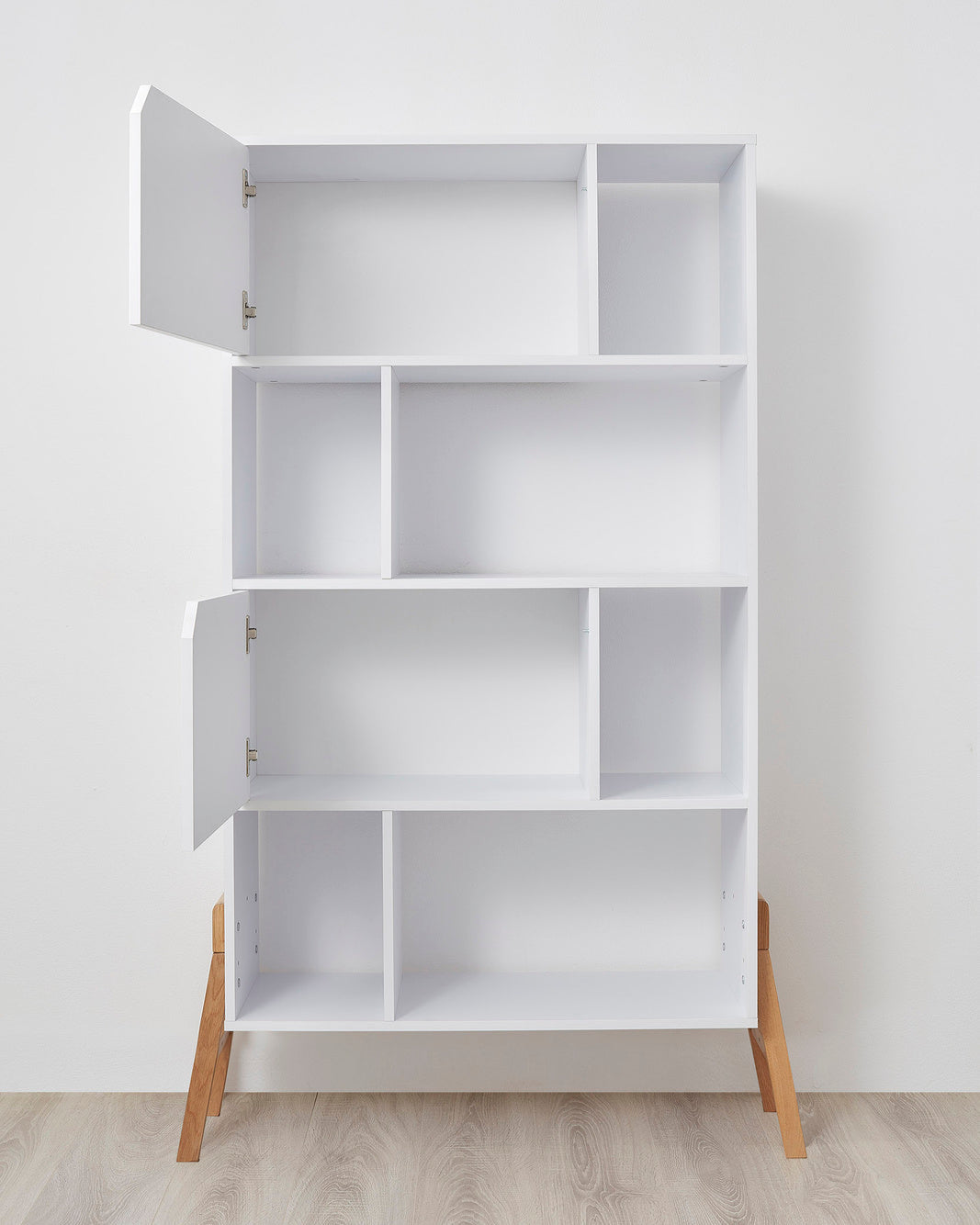 Erilevyiset hyllyt helpottavat tavaroiden organisointia, ja kaksi ovellista kaappia mahdollistavat siistin säilytyksen tai käytön vaatekaappina.