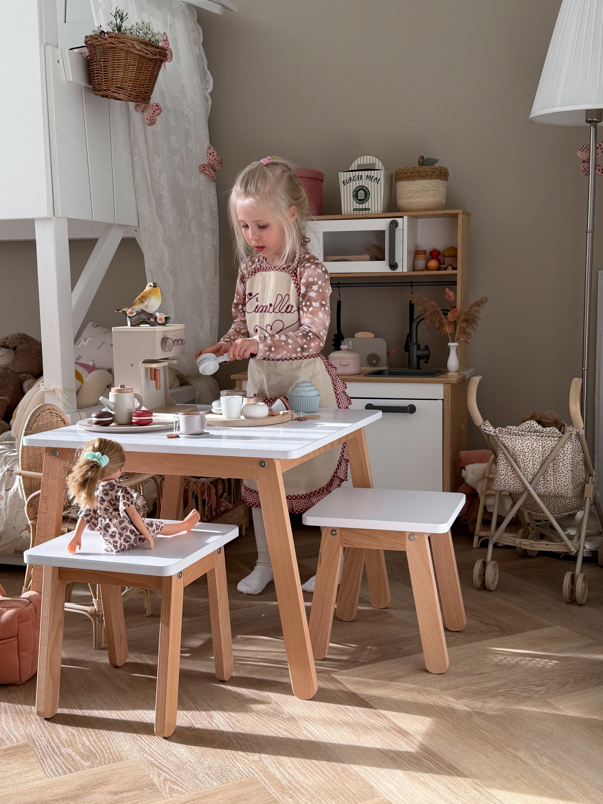 Woody-pöydät ja jakkarat ovat minimalistisia ja harmonisia tyyliltään, valmistettu turvallisista, kestävistä ja luonnollisista materiaaleista. Saatavilla kolmessa kauniissa värissä: puhtaan valkoinen, harmaa ja haalea roosa, joita voi yhdistellä ainutlaatuisiksi kokonaisuuksiksi.