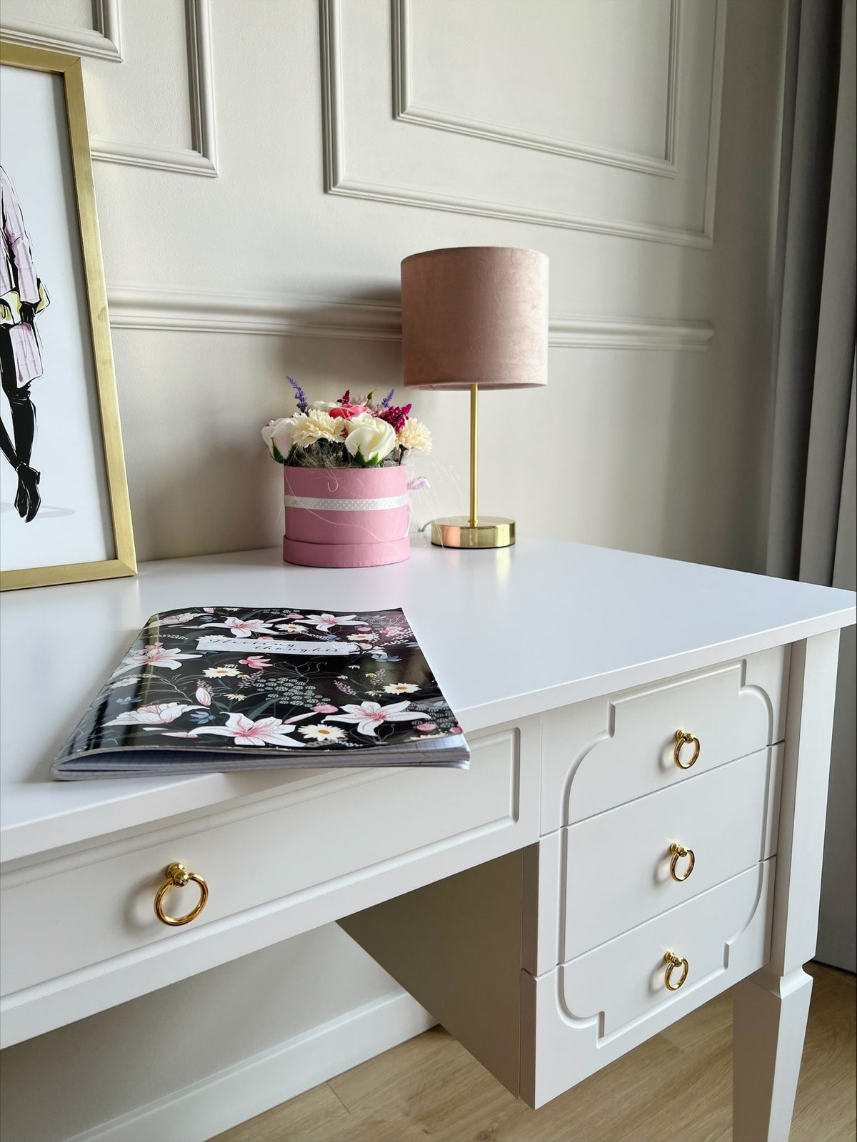 Royal kirjoituspöytä yhdistää elegantin muotoilun ja huolellisesti suunnitellut yksityiskohdat, tarjoten erinomaisen säilytysratkaisun työtiloihin ja lastenhuoneisiin. Pöytä on suunniteltu erityisesti niille, jotka arvostavat klassista tyyliä ja käytännöllisyyttä.
