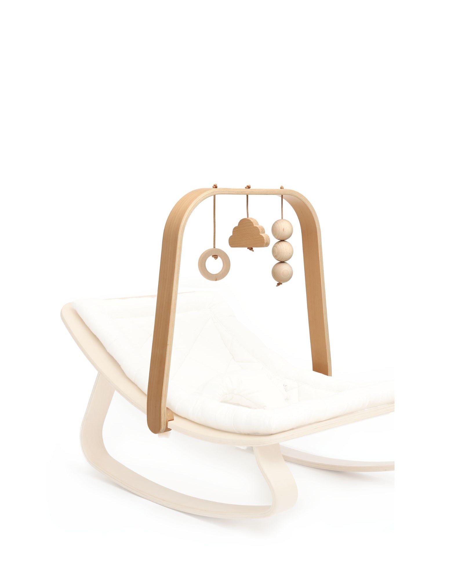 Lelukaari puisilla leluillaan on yhteensopiva LEVO-keinun kanssa. Kaareen kiinnitetyt luonnonpuiset lelut: pilvi, rengas ja puuhelmet viihdyttävät vauvasi LEVOssaan.