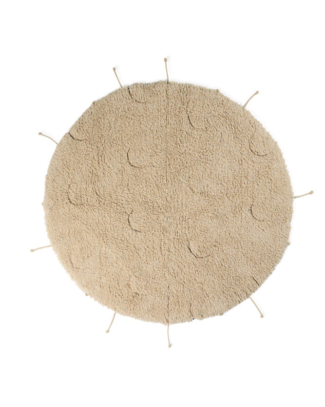 Luonnonpuuvillasta käsintehty matto lepää tummasävyisen kangaspohjan päällä, jota koristavat pienet yksityiskohdat, jotka muistuttavat puolikuun muotoon aseteltuja kraattereita.