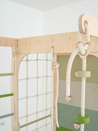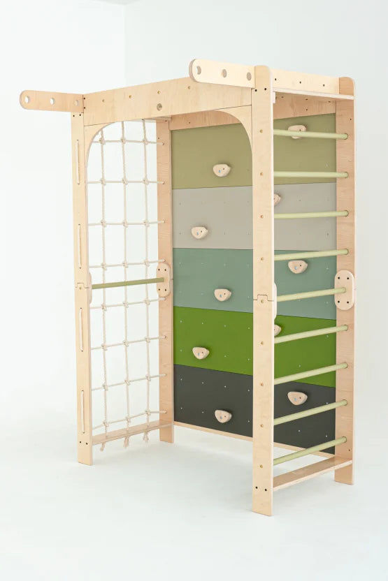 - Jos haluat lisätä haastetta, voit valita version, jossa mukana on myös kiipeilyseinä. Se antaa lapselle mahdollisuuden harjoitella kehonhallintaa ja lihasvoimaa leikin ohessa.