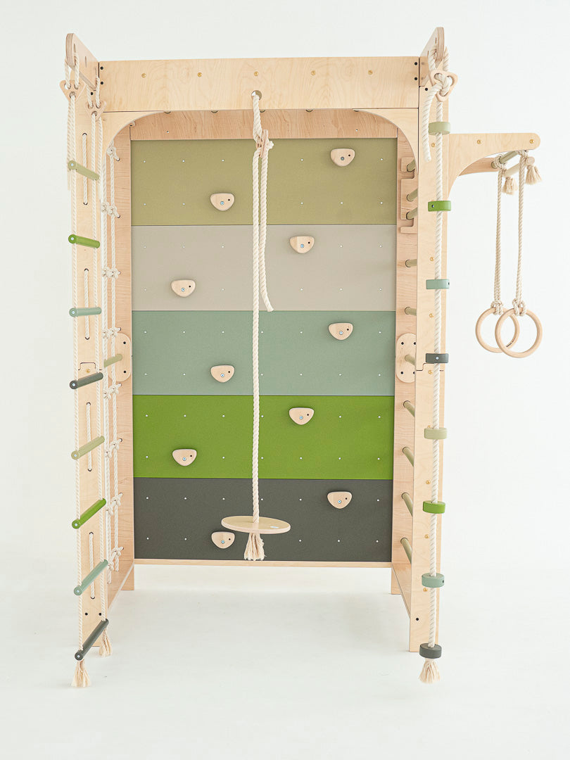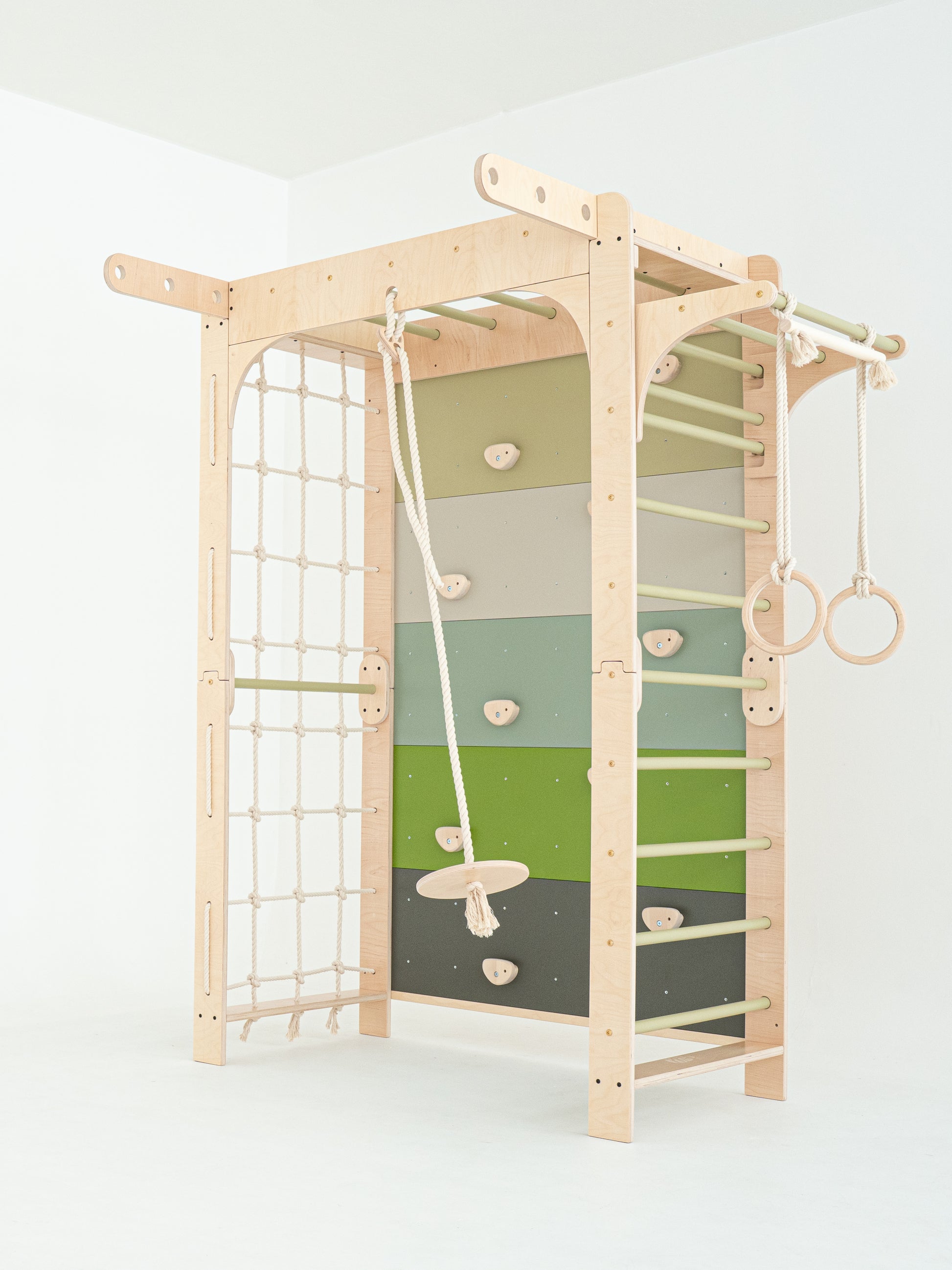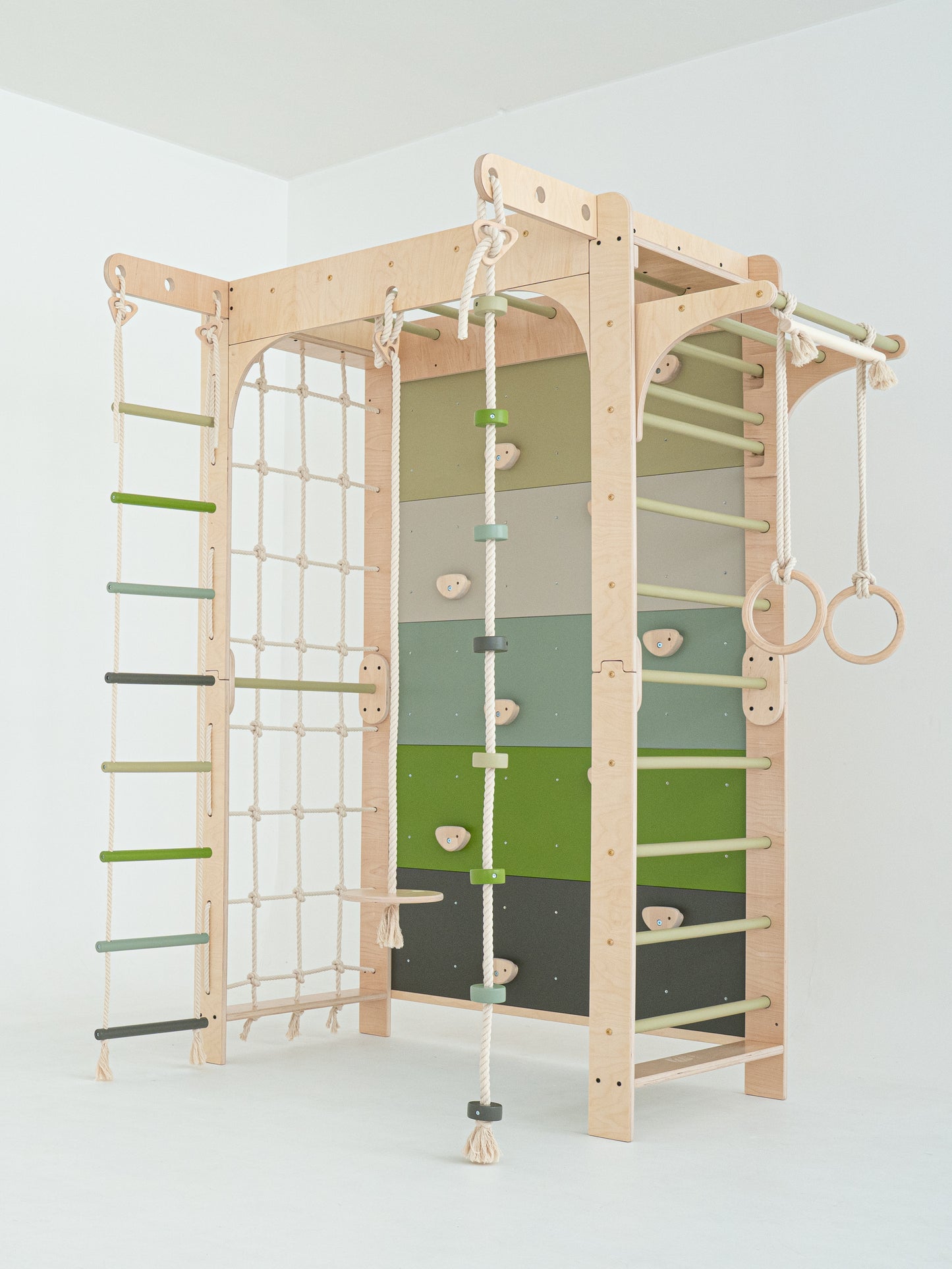 - Laajin vaihtoehto sisältää rungon, kiipeilyseinän, leuanvetotangon sekä useita hauskoja lisävarusteita, kuten kiipeilyköyden, köysitikkaat, köysikeinun ja voimistelurenkaat. Tämä täysi setti muuntaa kodin tilan pieneksi seikkailupuistoksi, jossa riittää tekemistä pitkäksi aikaa. Matto ei kuulu settiin.
