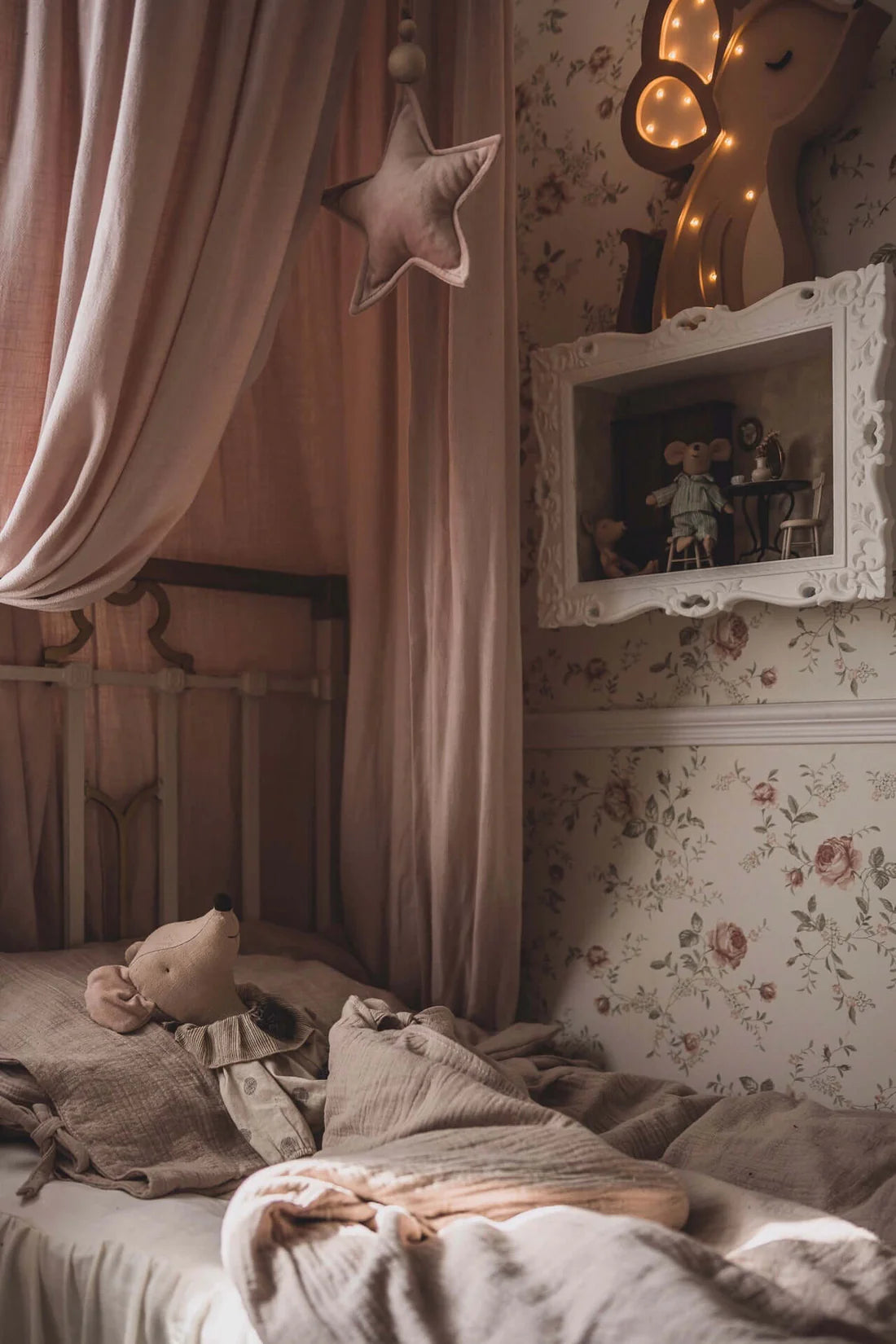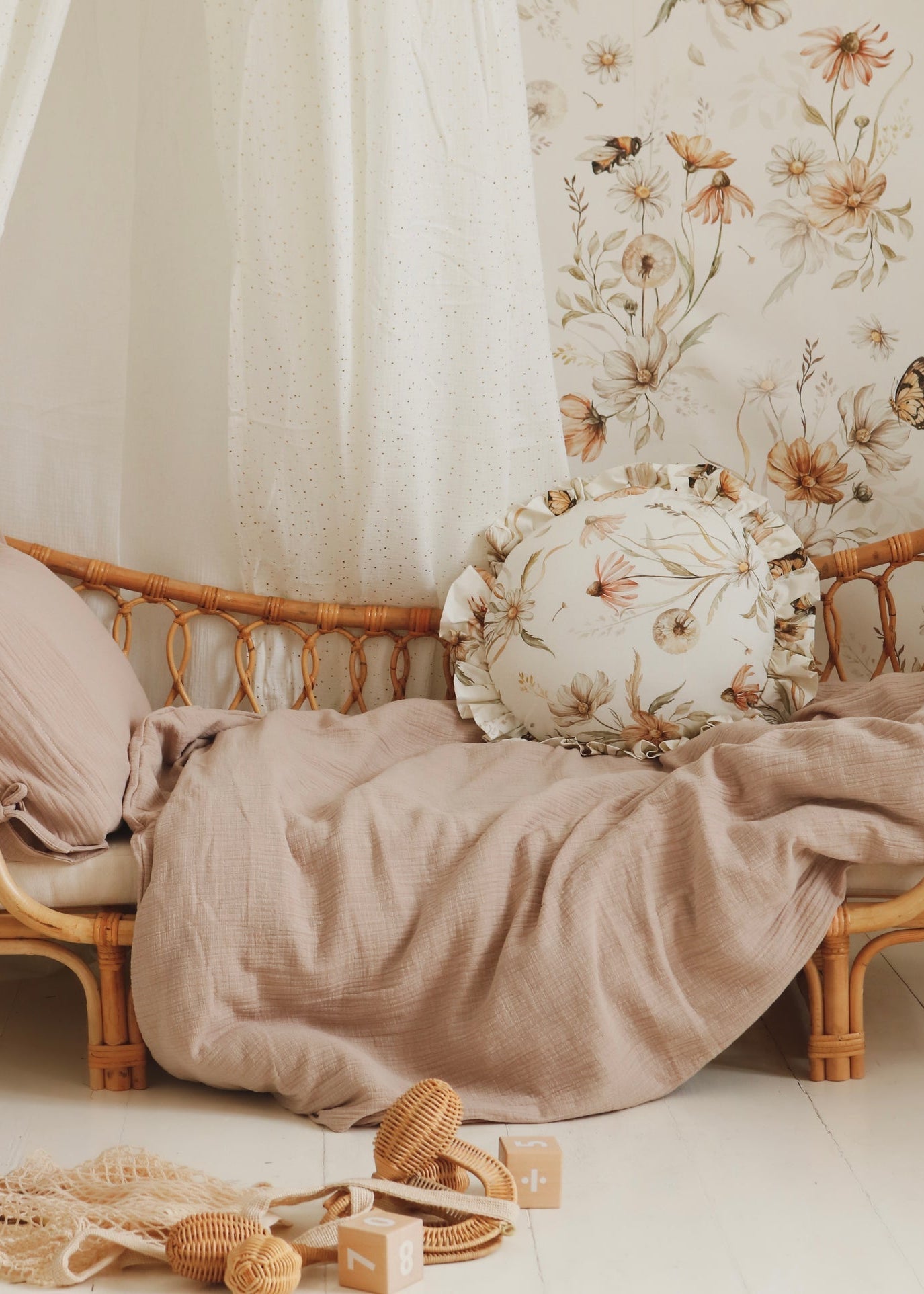 Tyylikäs beige musliini vuodevaatesetti on todella pehmeän ja miellyttävän tuntuinen. Erinomainen valinta myös aikuisten makuuhuoneeseen.
