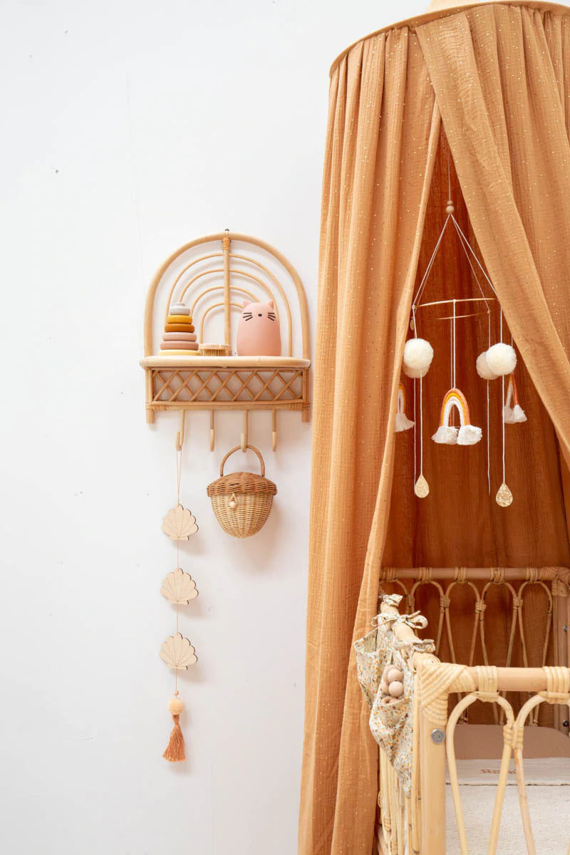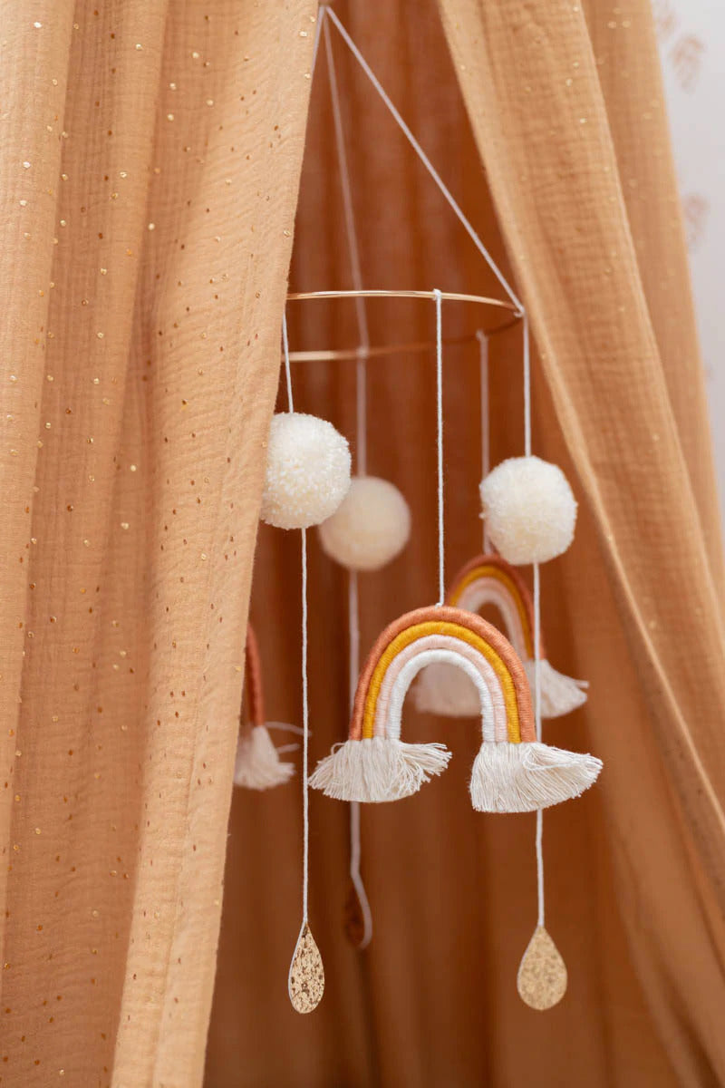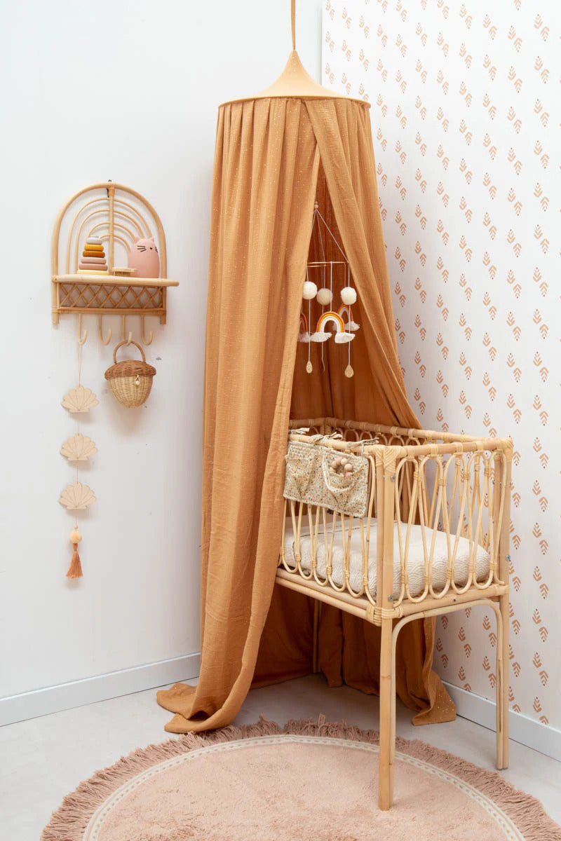 Vuodekatoksella luot viihtyisän ja rauhallisen oman tilan lapsellesi. Laadukas katosverho on valmistettu korkealaatuisesta musliini puuvillasta, jossa on kultaisia tähtiä. Katosverhon keskellä on silmukka, johon voit halutessasi kiinnittää ihania sisustuselementtejä.