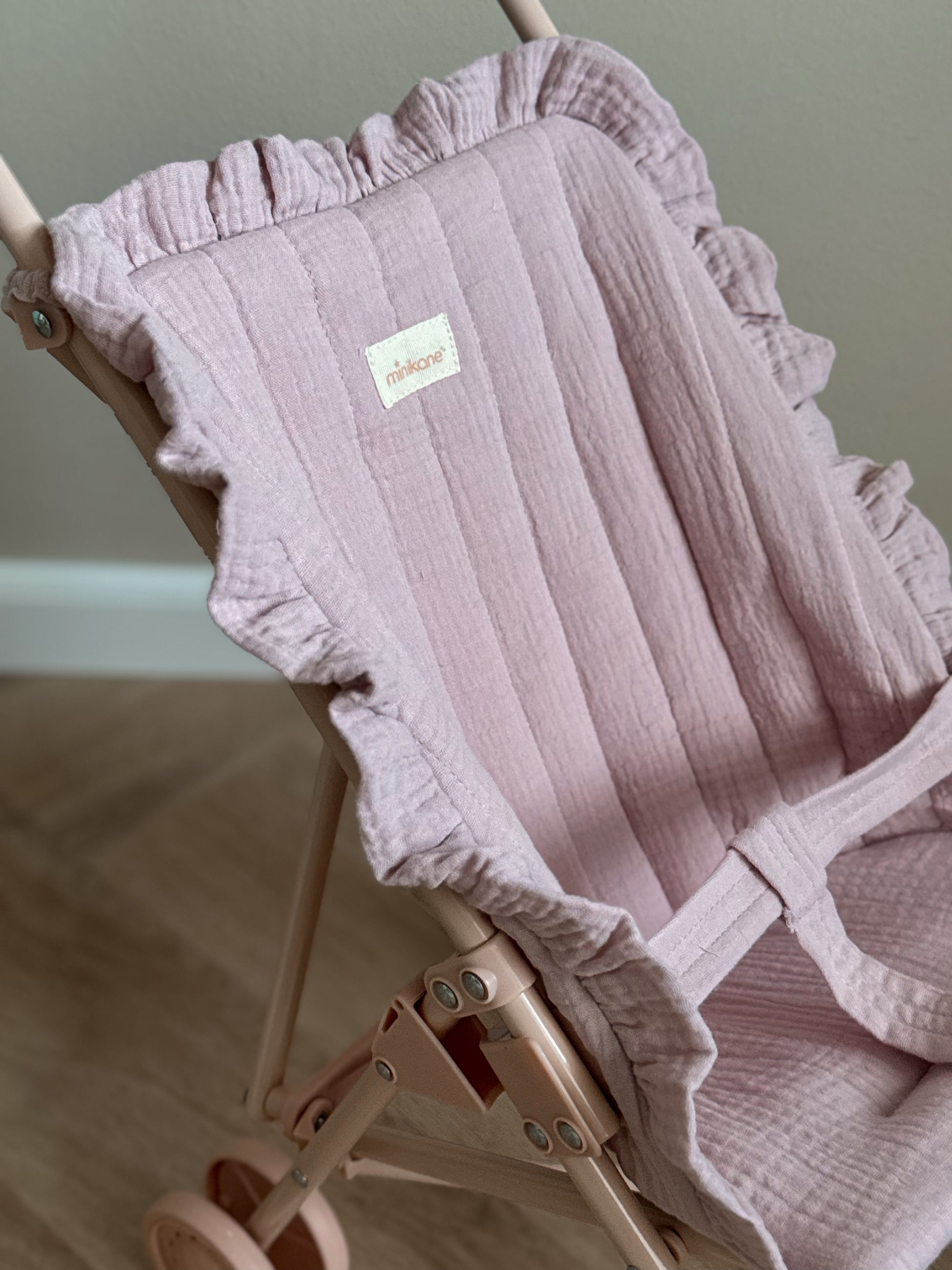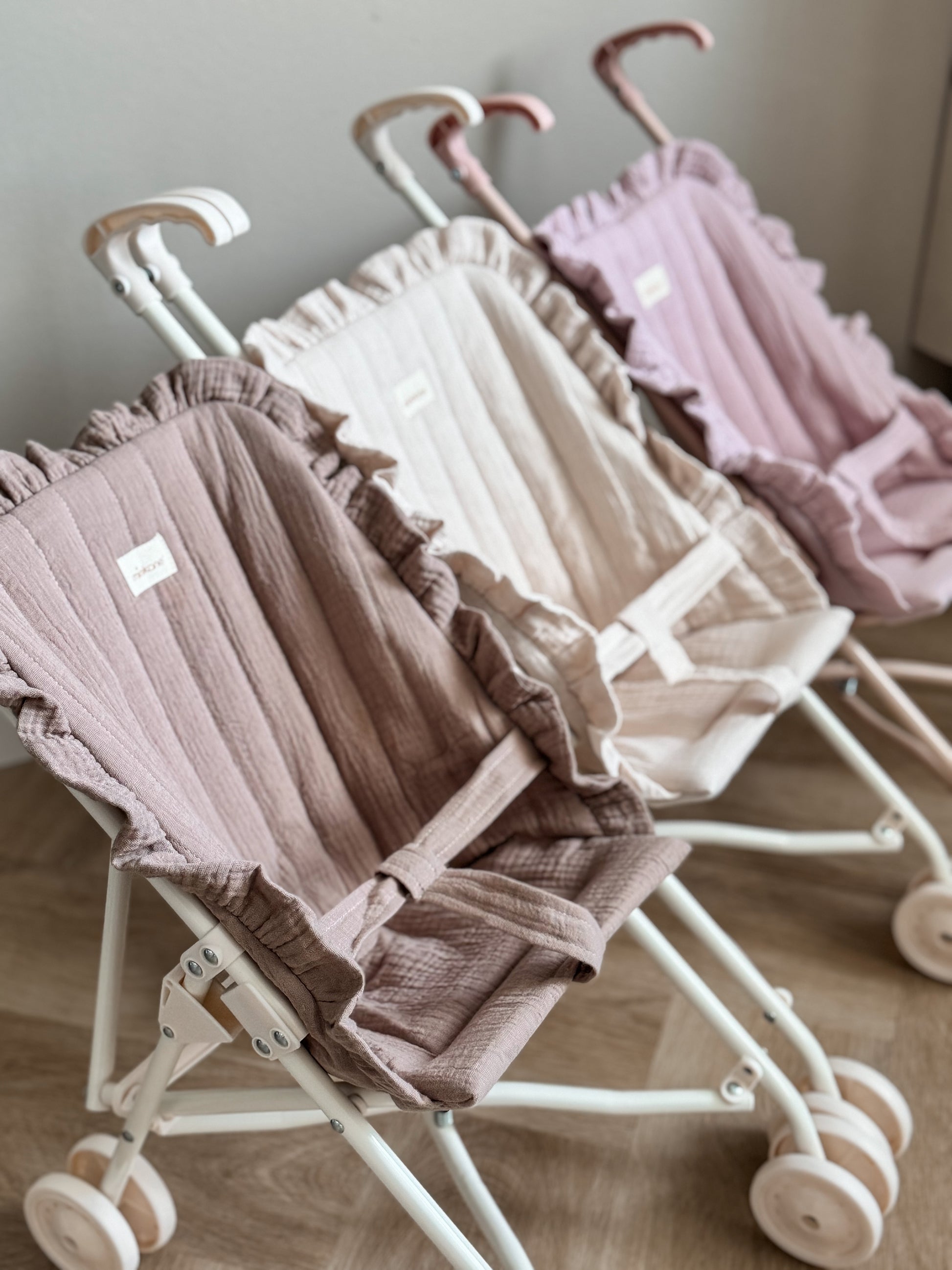 Suloiset ja käytännölliset taitettavat nukkerattaat, joissa on pehmustettu istuin kauniilla frillareunuksilla. Istuin on valmistettu kevyestä musliinikankaasta. Kermansävyinen metallirunko tekee rattaista tyylikkäät ja ajattomat.