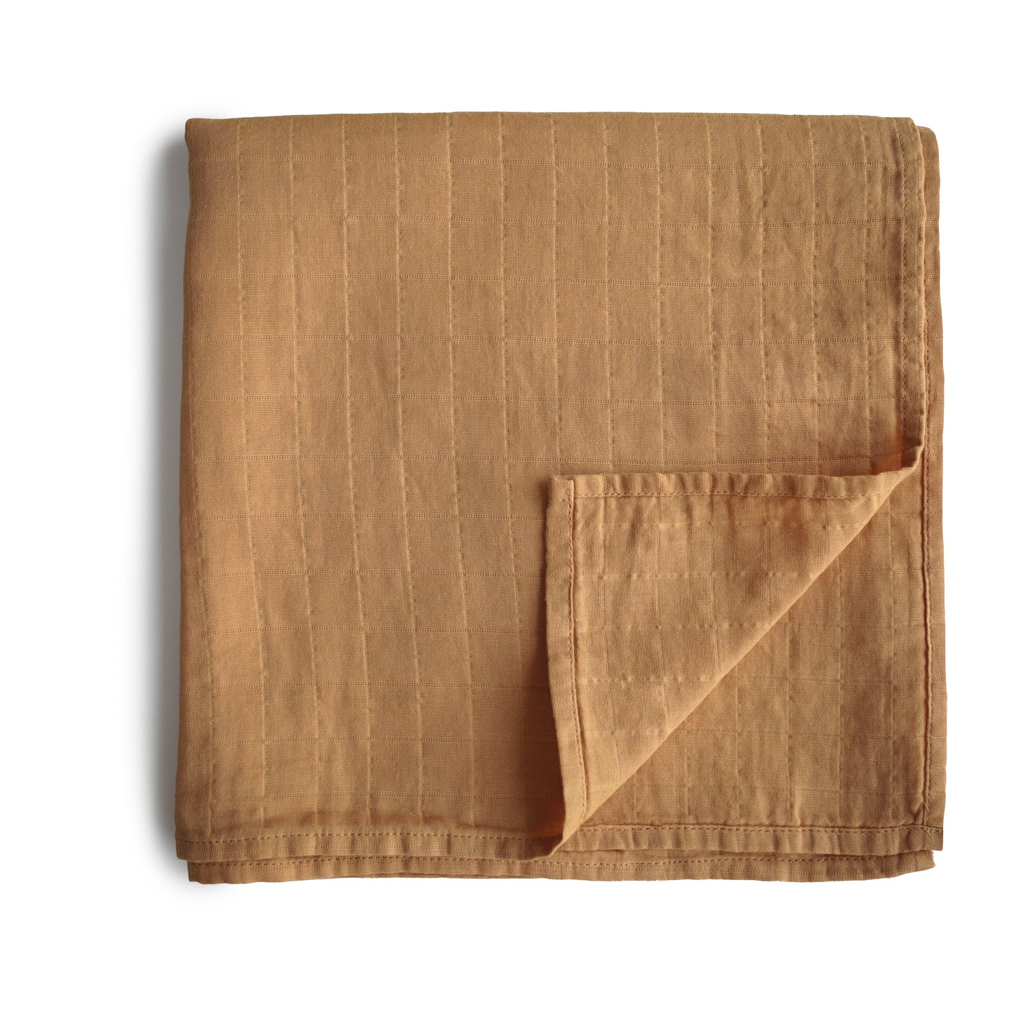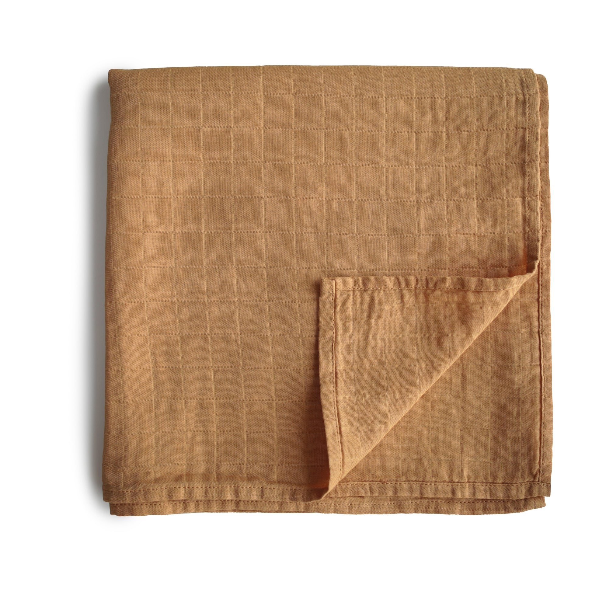 Mushie-merkin miellyttävän tuntuinen kapaloharso. Suurempi koko mahdollistaa vauvan kapaloinnin tai harson käytön peittona.