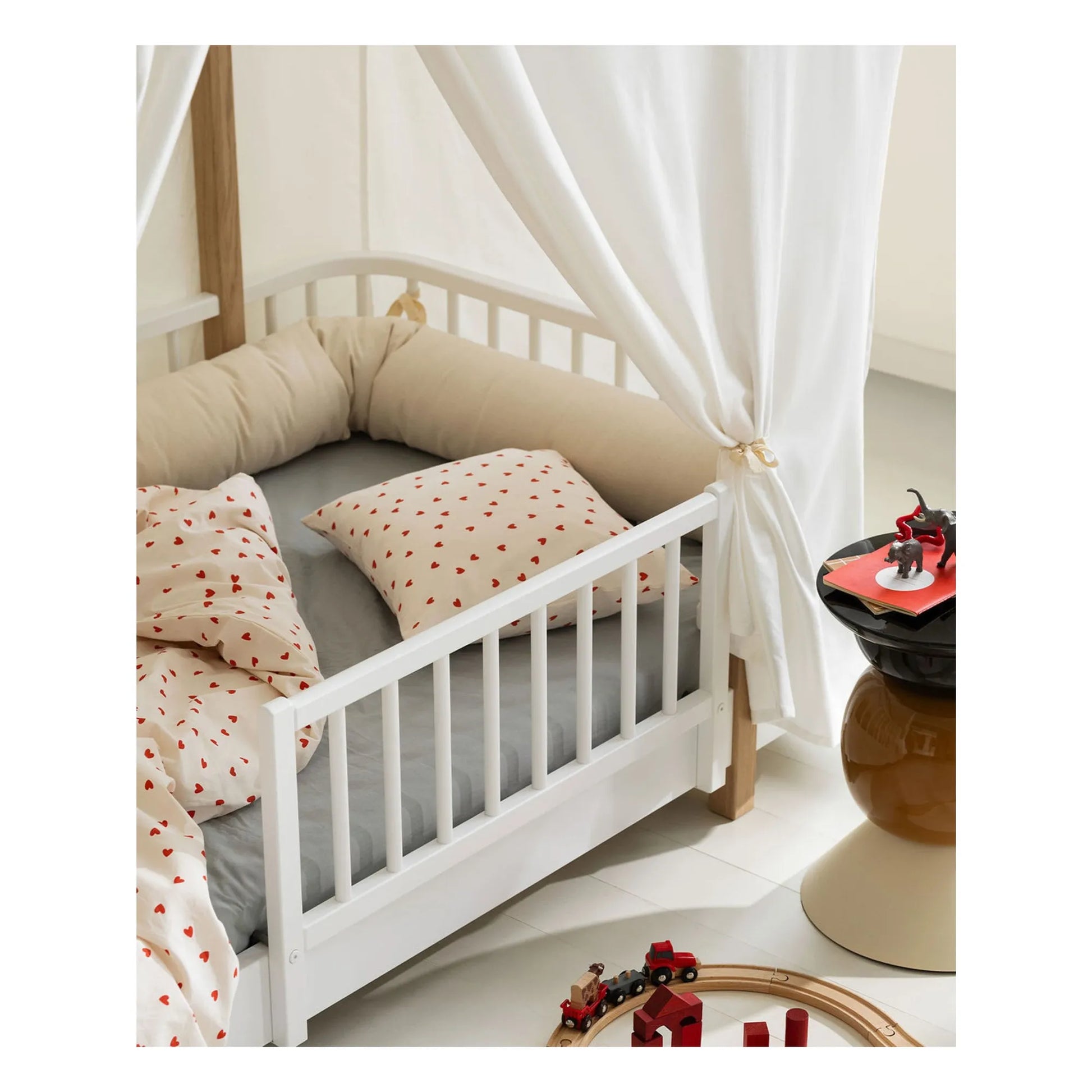 Tämä sänkyteltta on valmistettu pehmeästä, orgaanisesta puuvillasta ja tuo sänkyyn lämpimän ja kodikkaan ilmeen. Se sopii täydellisesti päiväunien ja leikkien ajaksi, mutta myös rauhallisiin hetkiin ennen nukkumaanmenoa. Teltta voidaan sulkea kokonaan, jolloin siitä muodostuu pieni piilopaikka, tai sitoa sivuille, jolloin sänky pysyy avoimena.