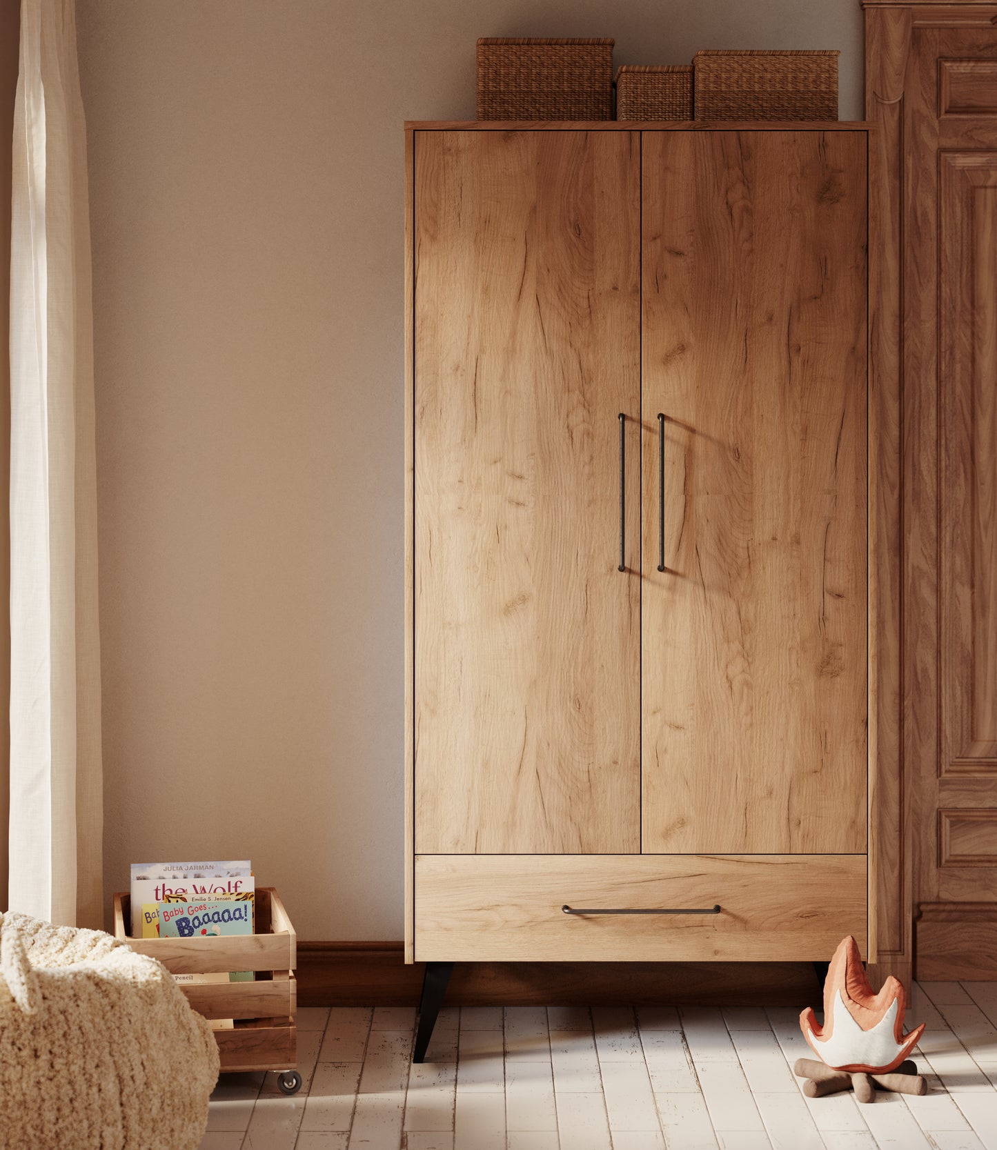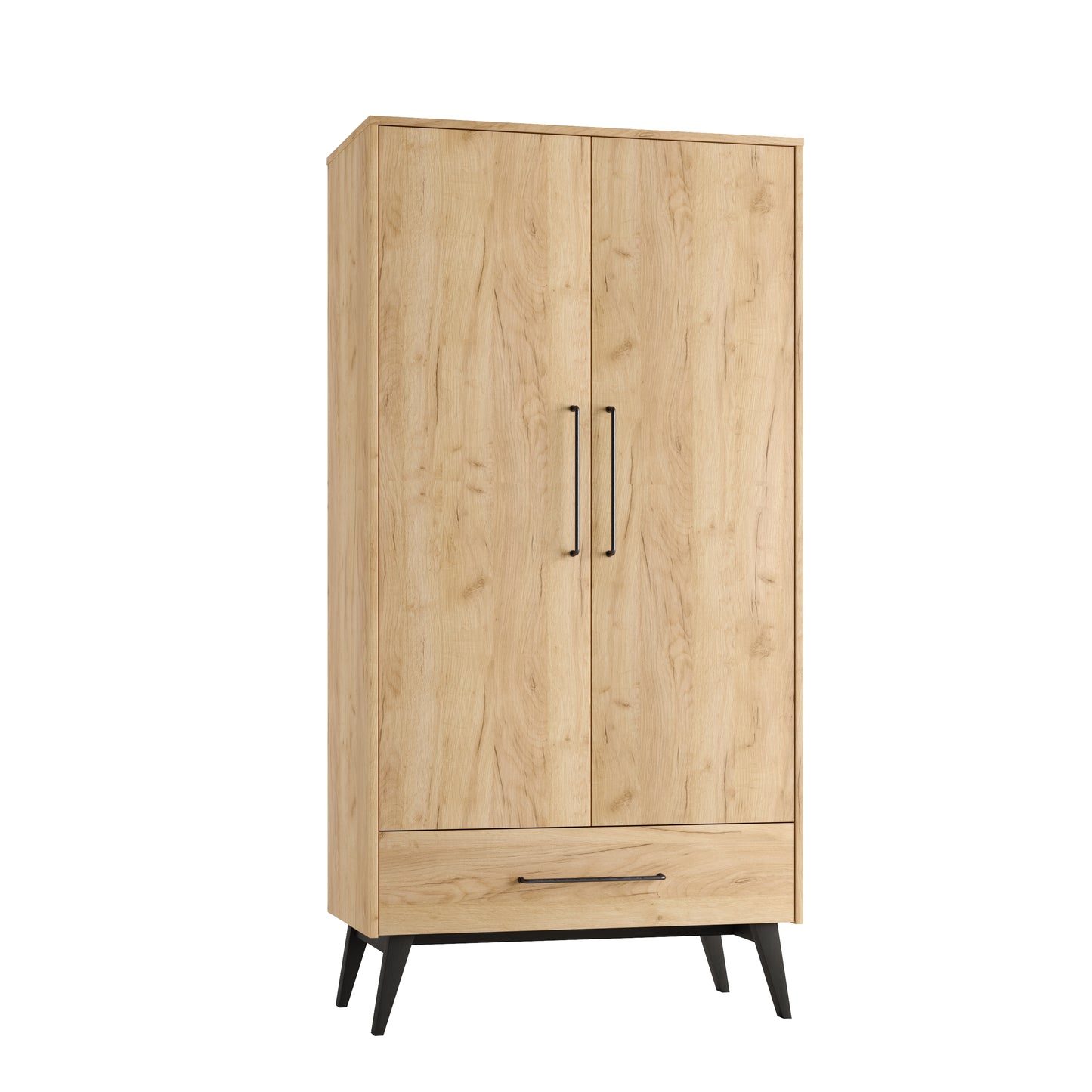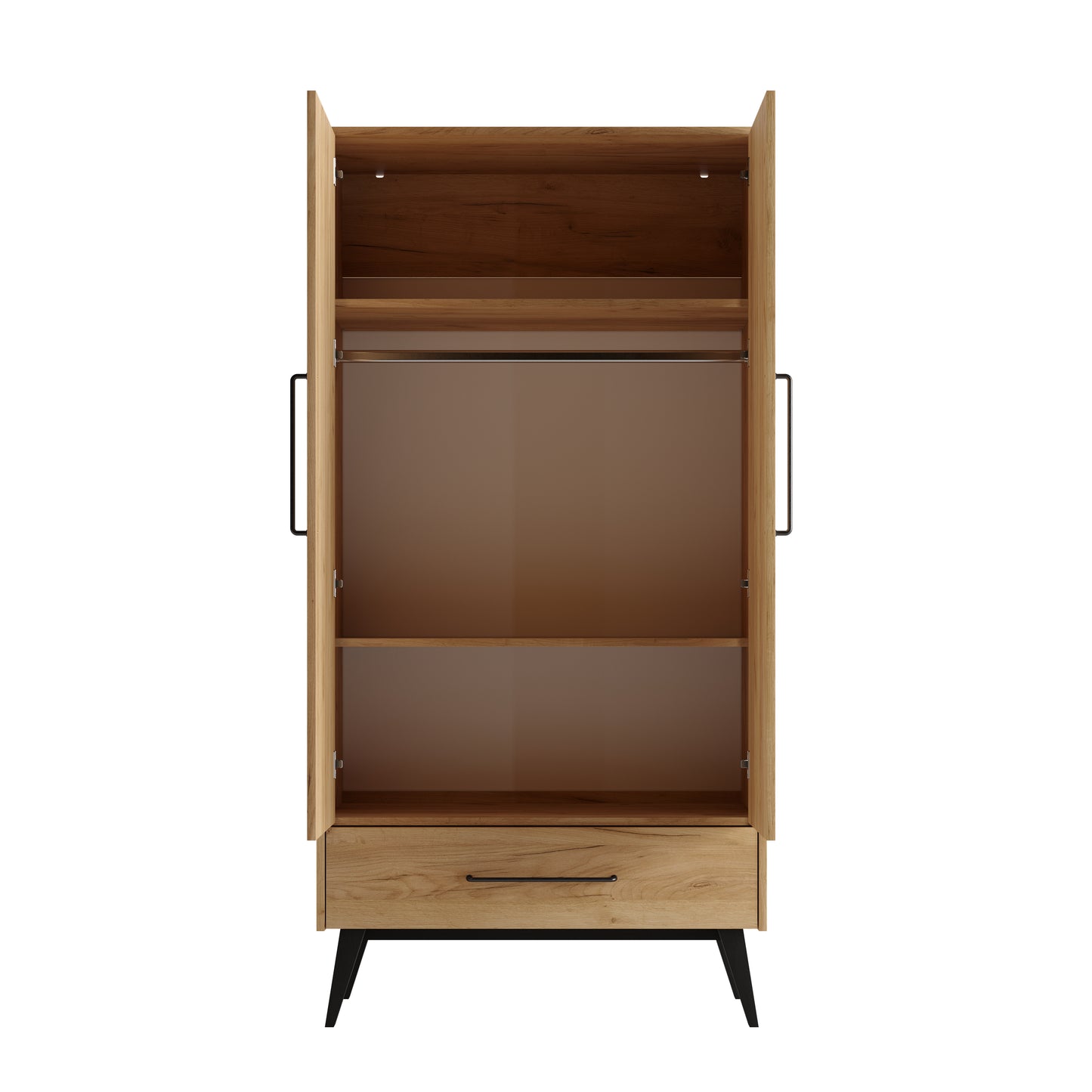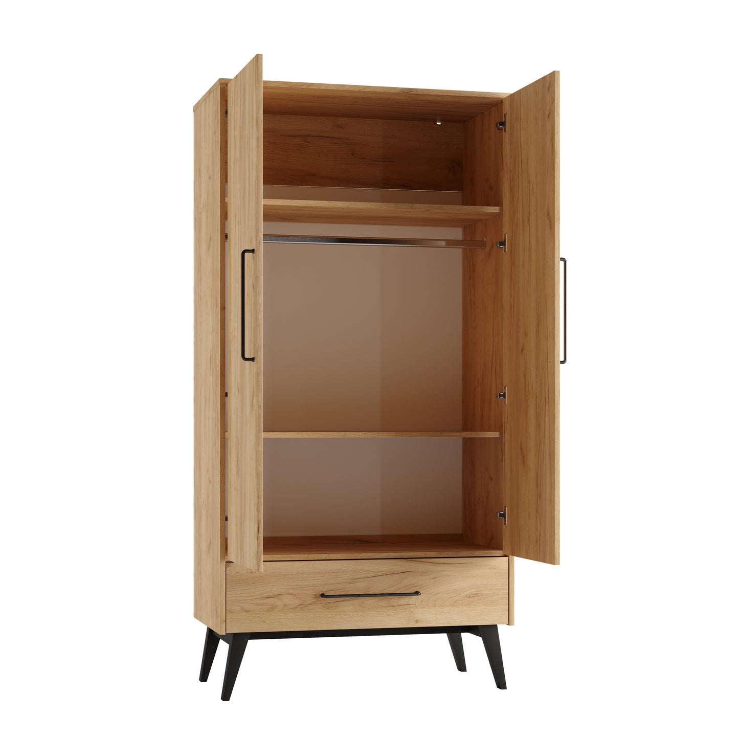 Retro sarjan loft-tyylinen vaatekaappi. Kaikissa ovissa ja laatikoissa on soft-close sulkeutuminen, jonka ansioista ovet ja laatikot sulkeutuvat aina pehmeästi. On myös mahdollista ostaa lisähylly.