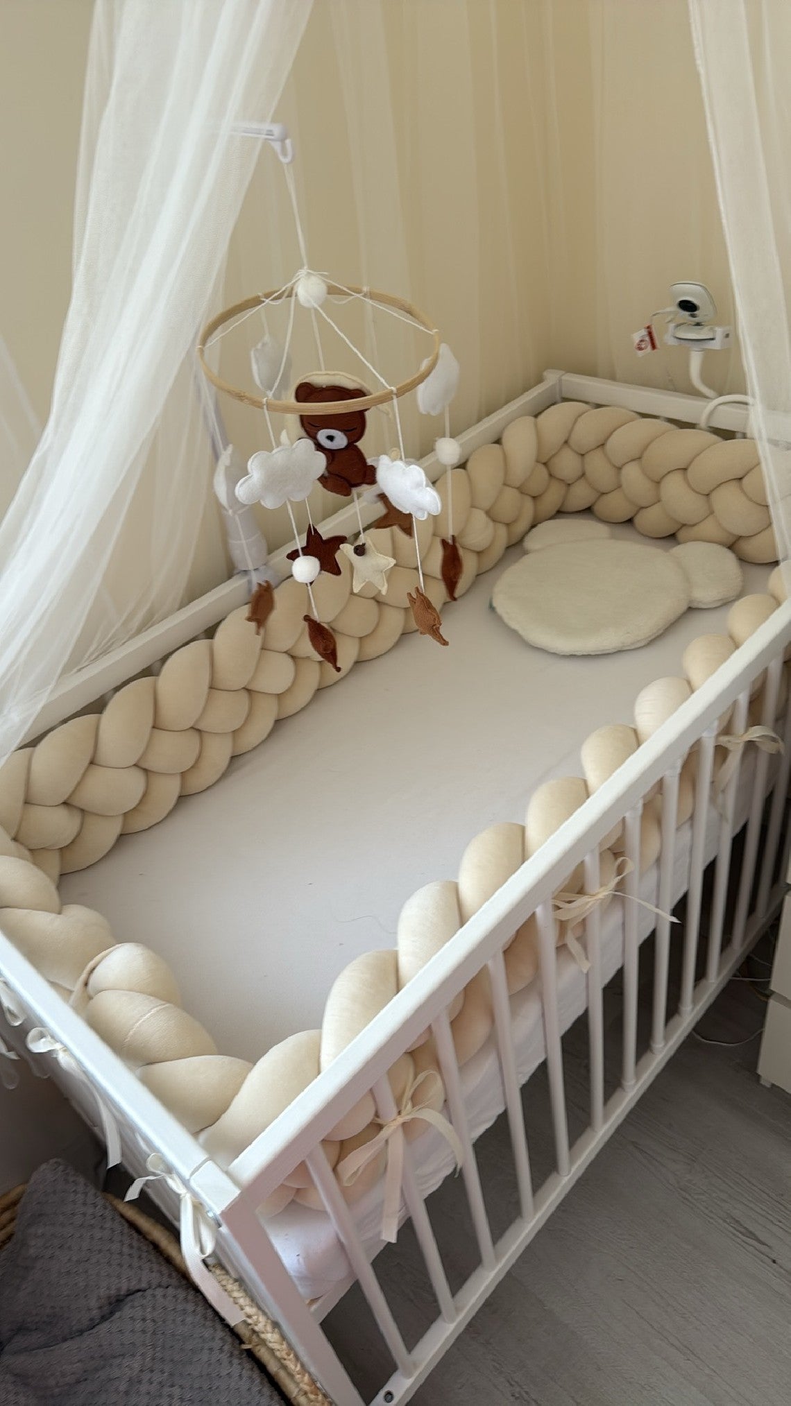 Tyylikäs ja muhkea lettimäinen reunapehmuste pinnasänkyyn tuo huoneeseen kauniin ilmeen samalla suojaten vauvaa säleiden kolhuilta ja kylmiltä pinnoilta. Pehmeä ja hengittävä materiaali takaa turvallisuuden, ja sen letinmuotoinen rakenne lisää erityistä tyyliä. Helppohoitoinen ja konepestävä, tämä reunapehmuste on täydellinen valinta moderniin ja kodikkaaseen lastenhuoneeseen. Kiinnitys nauhoilla.