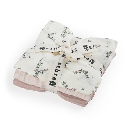 Kolmen musliiniliinan setti, jokainen kooltaan 75 x 75 cm, valmistettu luomumusliinipuuvillasta. Pakkaukseen sisältyy kaksi yksiväristä, toisiinsa sointuvaa musliiniliinaa sekä yksi Powder Blossom -kuosinen liina.
