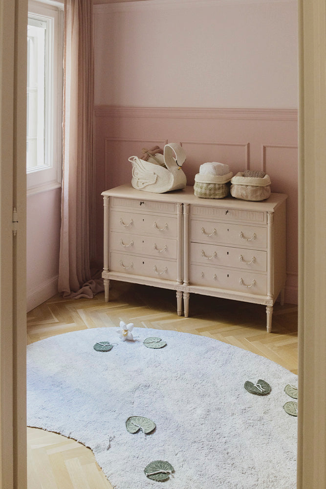 Sukella Joutsenlampeen ja anna pienten mielikuvitusten leijua. Interaktiivinen matomme on todellinen taideteos. Se on helppo yhdistää muihin sisustuselementteihin ja sisältää seitsemän kaksipuolista lumpeenkukkaa, joista jokainen on huolellisesti käsintehty herkillä kaksisävyisillä lehdillä ja yksityiskohtaisilla kukkakoristeilla. Lumpeenkukat on kiinnitetty harkitusti maton omilla langoilla, mikä tuo lisää käsityön tuntua.