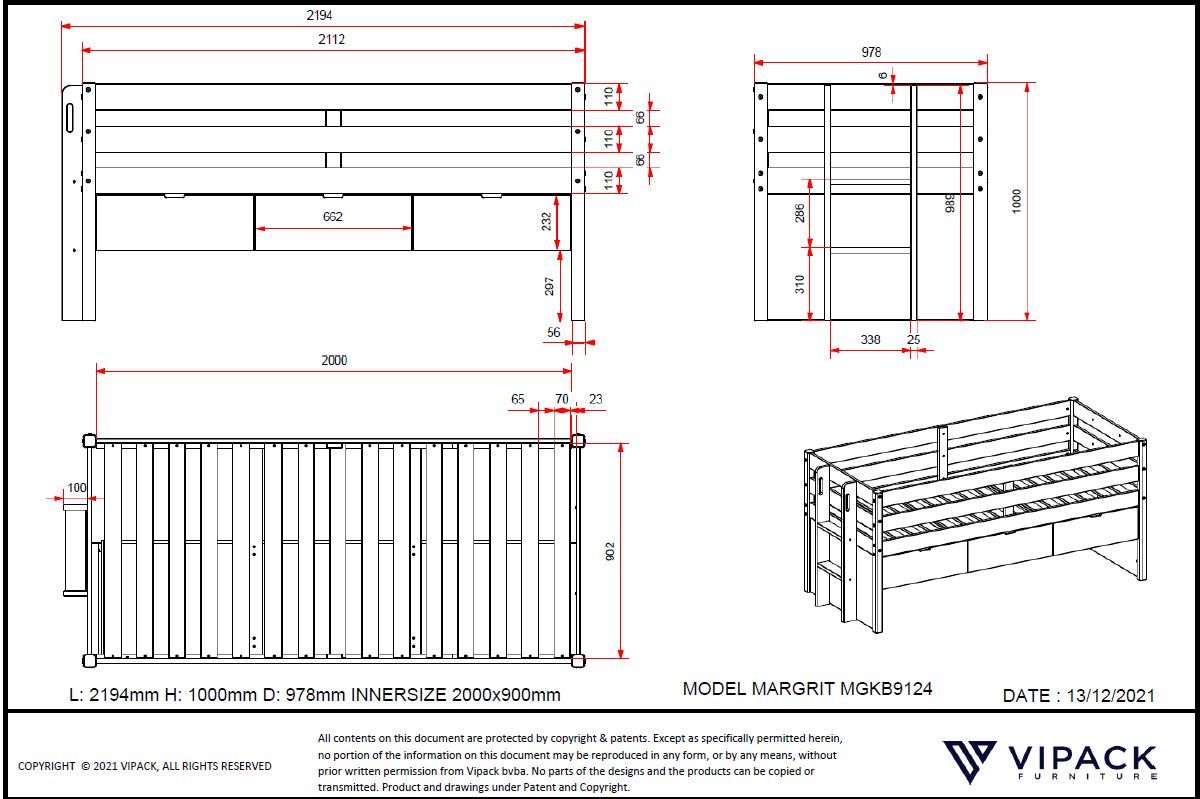 Vipack, Margrit, Sänky 90x200cm + Lisävuode + Säilytyslaatikot