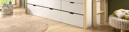 MARGRIT-sänky 90 x 200 cm on enemmän kuin pelkkä sänky – se on mukava paikka rentoutua, lukea ja rauhoittua. Lämmin valkoinen ja luonnonsävyt tuovat tilaan raikkaan skandinaavisen ilmeen. Sängyn alta löytyy kolme säilytyslaatikkoa. Kätevä lisävuode tarjoaa nukkumapaikan yökyläilijälle tai lisätilaa säilytykseen. Täydellinen valinta lasten- tai vierashuoneeseen!