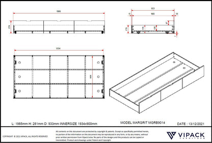 - Laatikon mitta: 198,5 x 93,4 ja korkeus 27,4 cm, laatikon painoraja on 75kg.