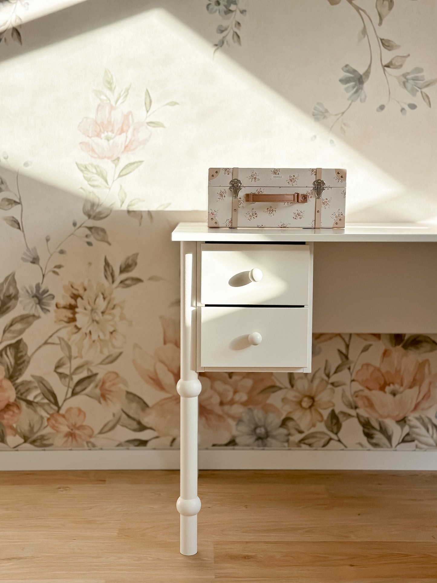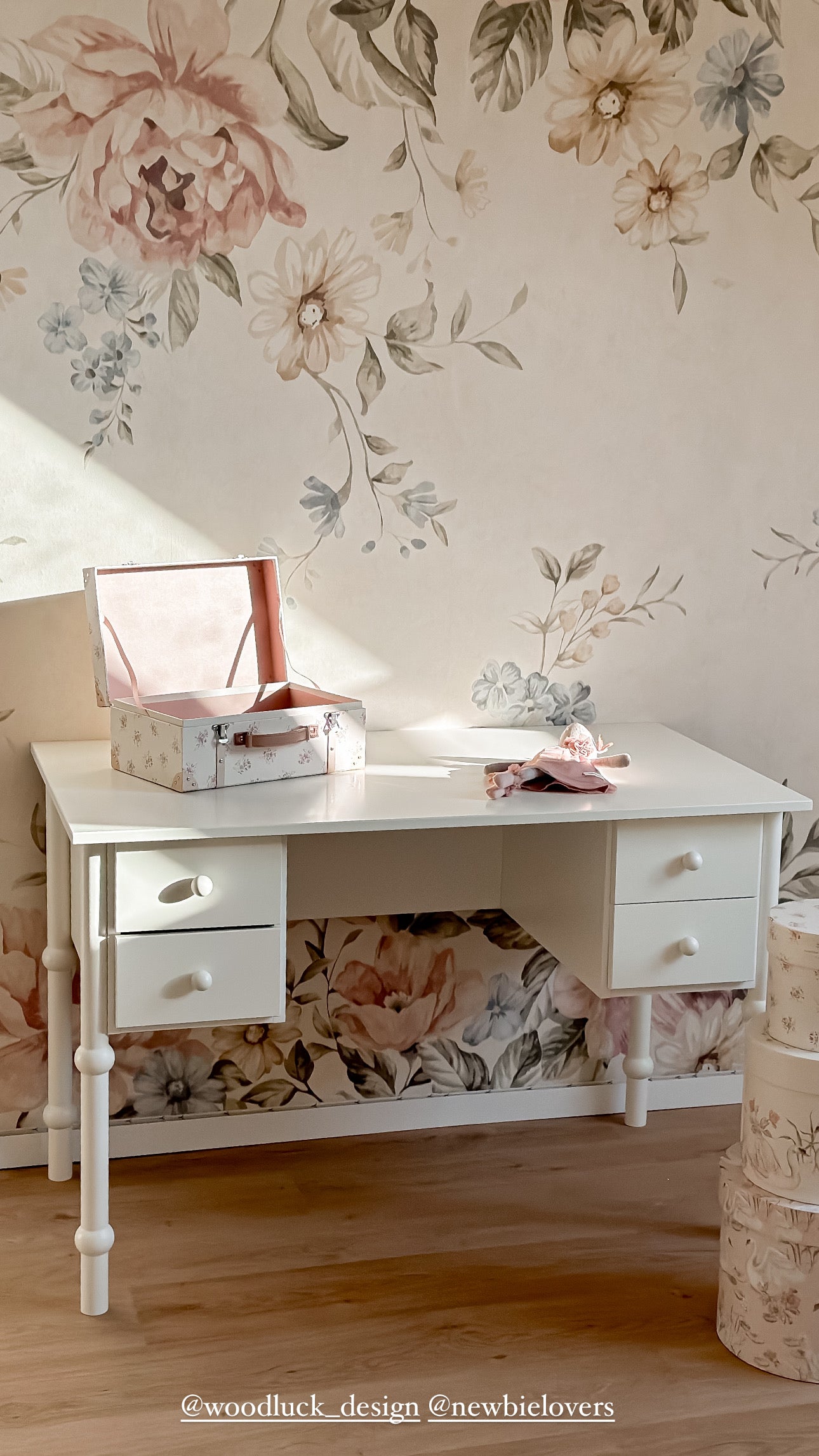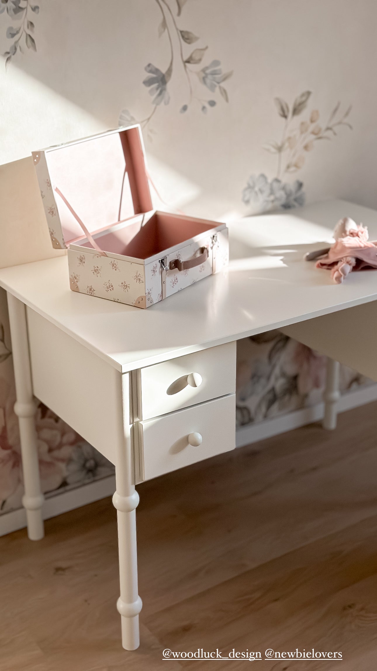 Ett fantastiskt vackert vitt skrivbord vars storlek passar både barn och vuxna. Babushka skrivbordet har fyra lådor utrustade med självstängande skenor. Lådornas innermått är: 18 x 44 x 7,5 cm (bredd x djup x höjd). Avståndet från golvet till bordets ovansida är 75 cm, och utrymmet reserverat för en stol mellan lådorna är 50 cm. Bordsskivans mått är 65 x 113 cm. Vi rekommenderar att du använder glasunderlägg för att hålla bordsskivan i gott skick så länge som möjligt.