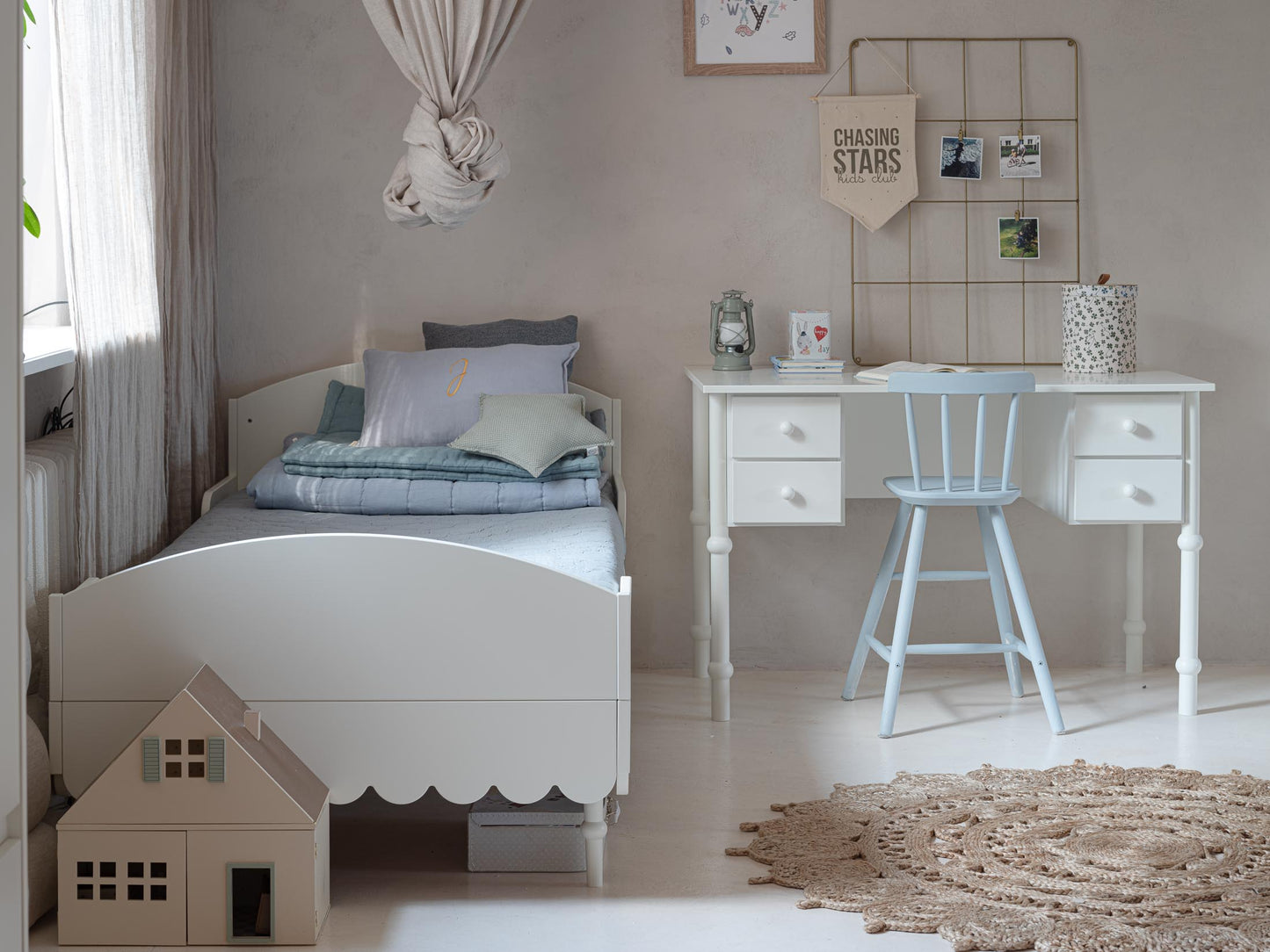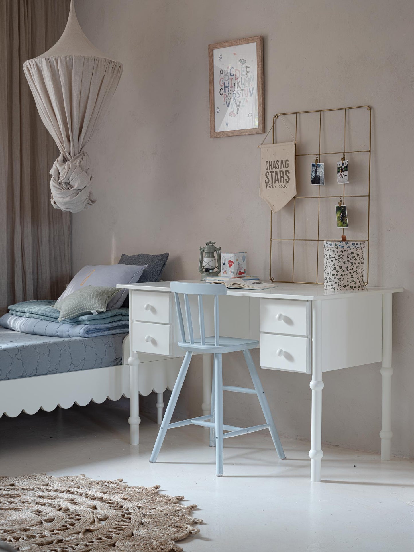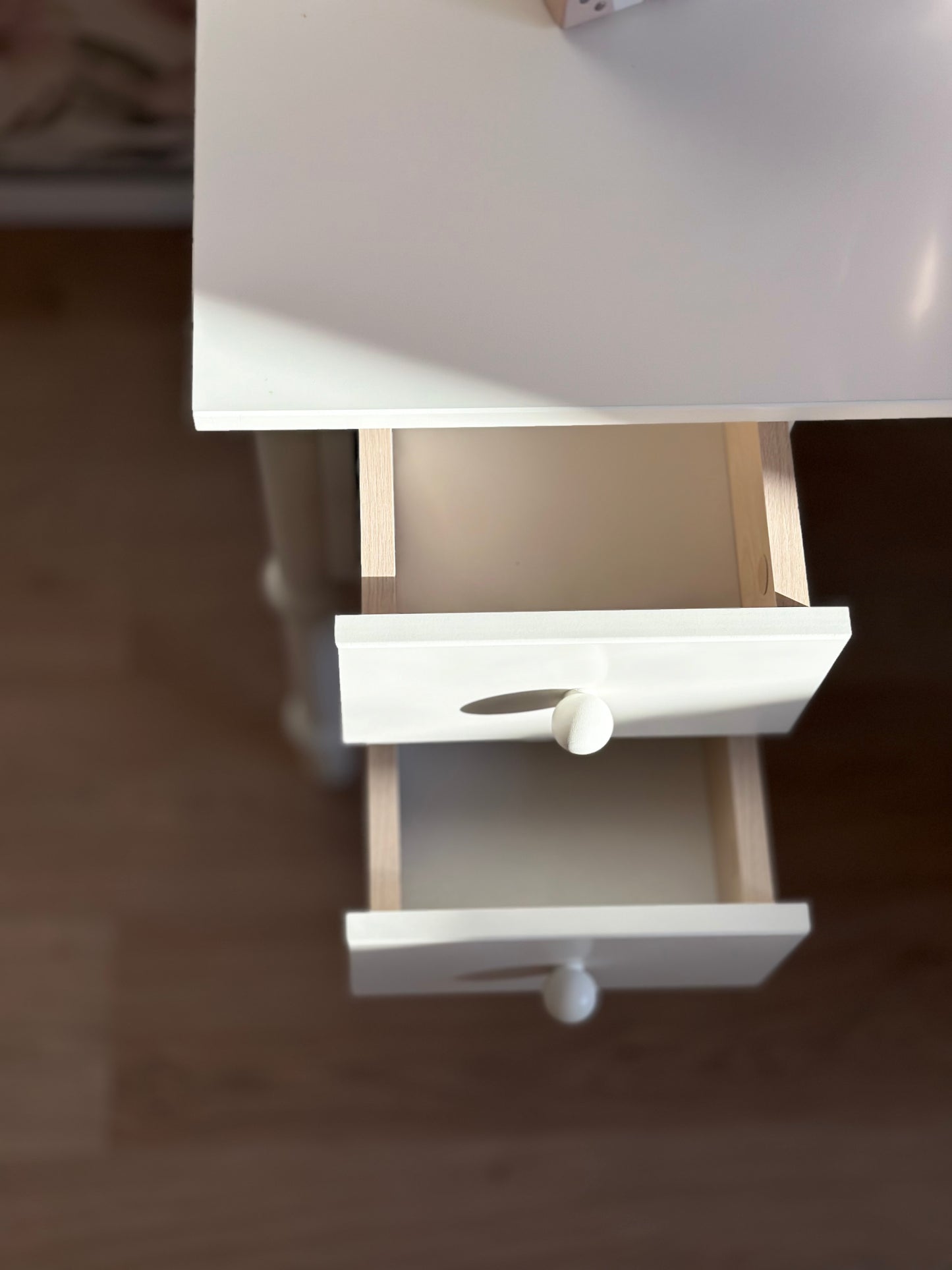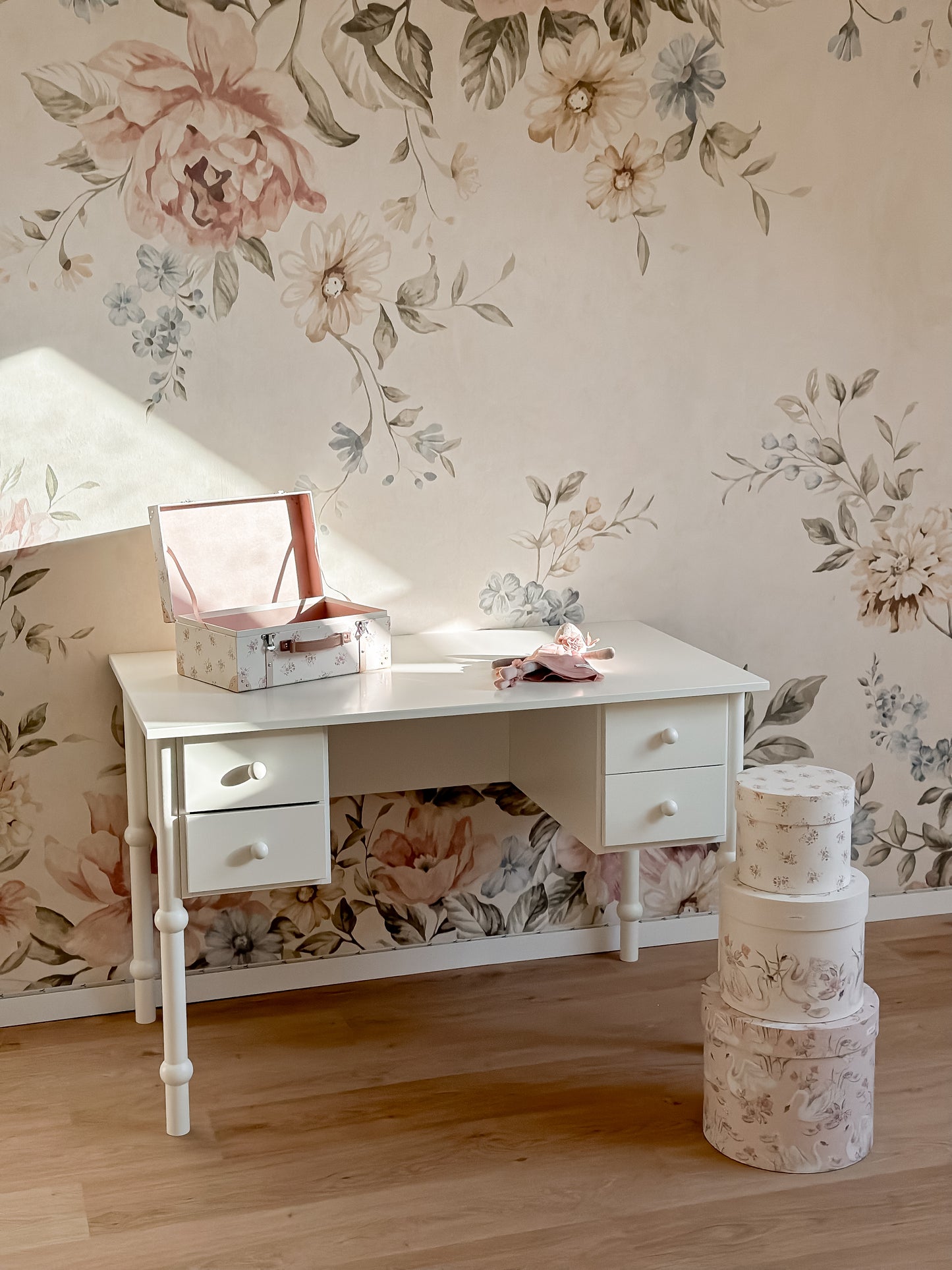 Ett fantastiskt vackert vitt skrivbord vars storlek passar både barn och vuxna. Babushka skrivbordet har fyra lådor utrustade med självstängande skenor. Lådornas innermått är: 18 x 44 x 7,5 cm (bredd x djup x höjd). Avståndet från golvet till bordets ovansida är 75 cm, och utrymmet reserverat för en stol mellan lådorna är 50 cm. Bordsskivans mått är 65 x 113 cm. Vi rekommenderar att du använder glasunderlägg för att hålla bordsskivan i gott skick så länge som möjligt.