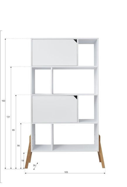 Hyllor i olika bredder gör det enkelt att organisera saker, och två skåp med dörrar möjliggör prydlig förvaring eller användning som garderob.
