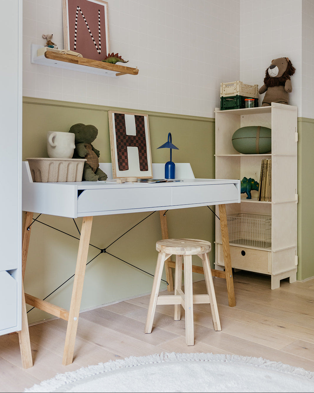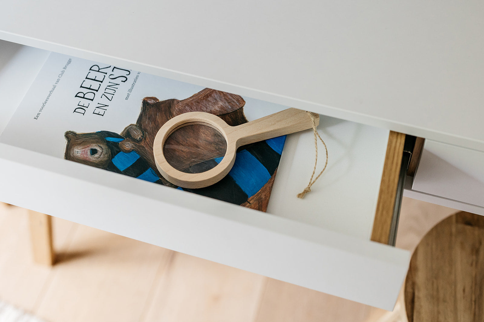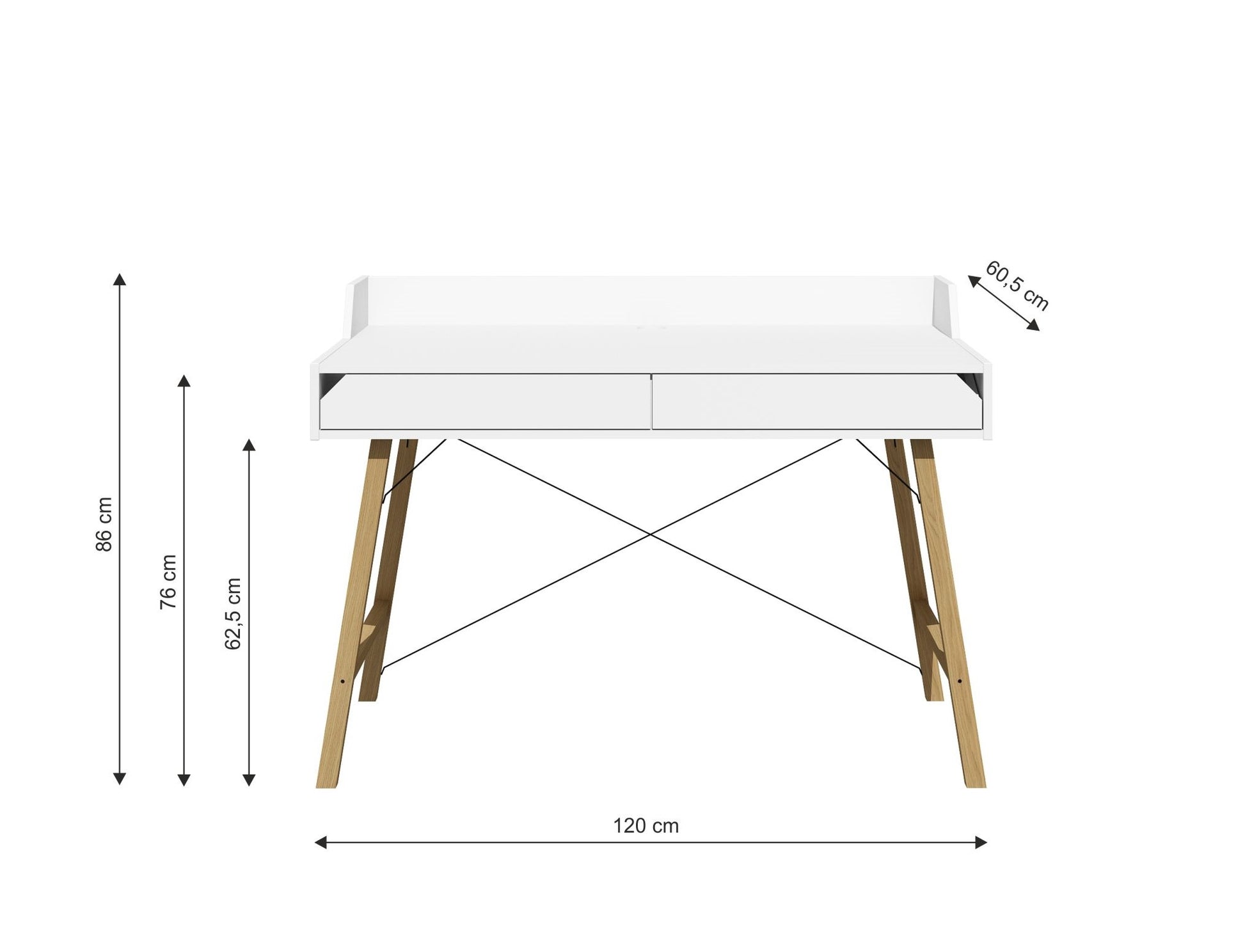 Detta skrivbord är noggrant designat med känsla för detaljer. Tack vare sin enkla form ger den en minimalistisk stil till din arbetsyta. Bordet har två rymliga lådor, med kanter för att förhindra att föremål faller ut. Det finns ett hål för placering av kablar.