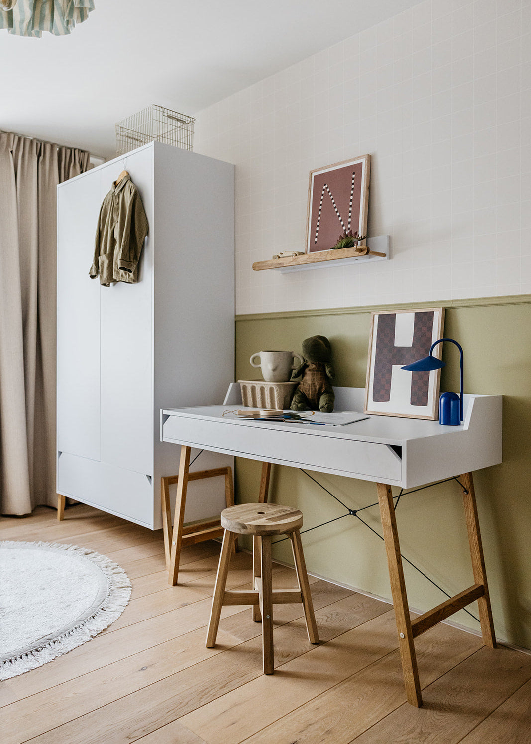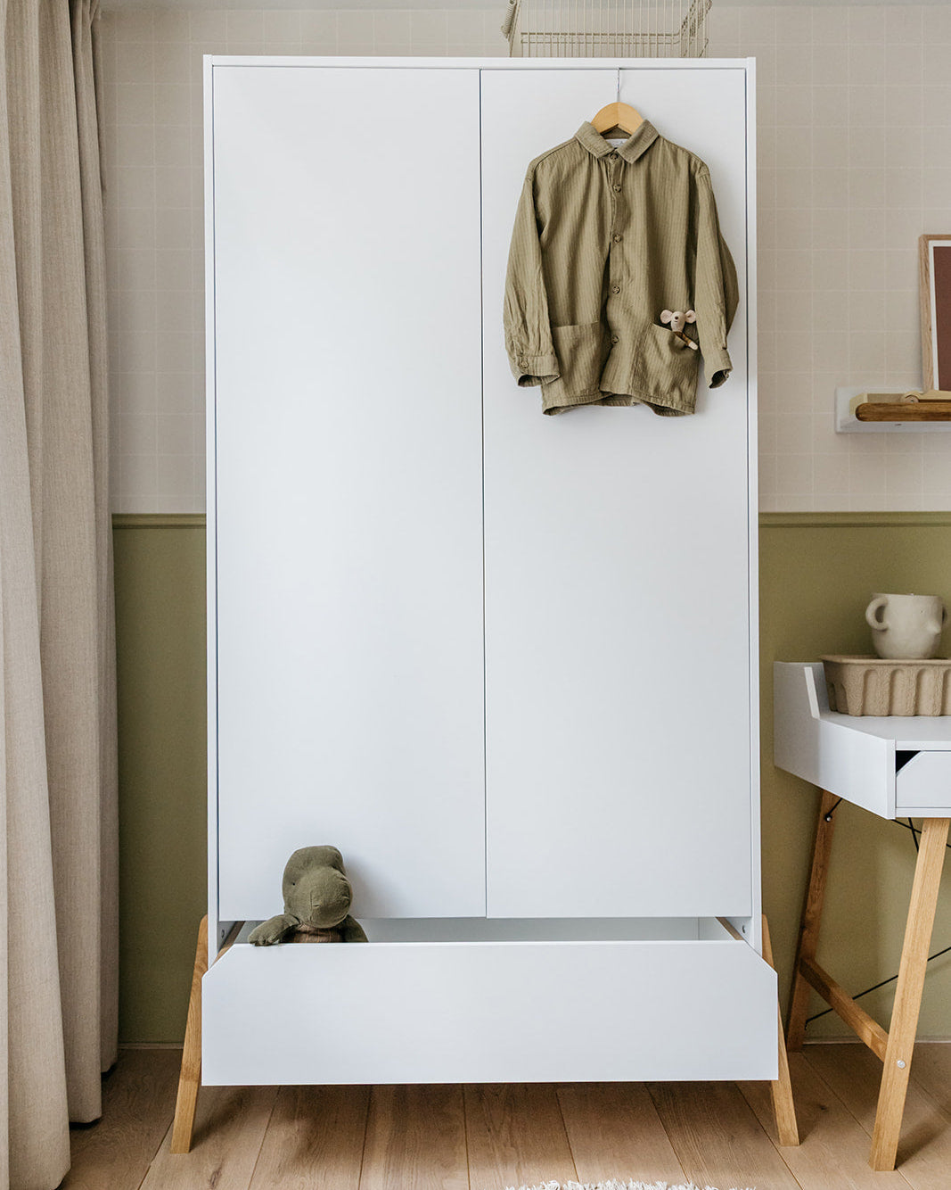 En rymlig garderob i två delar är en viktig möbel för ett barnrum. Garderoben är uppdelad i två delar: på ena sidan finns en klädstång för att hänga kläder och en justerbar hylla under, på den andra sidan finns fyra hyllor, varav tre är höjdjusterbara. Dessutom finns en separat, rymlig låda under garderoben.