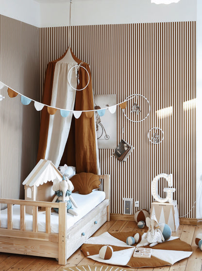 Med en sänghimmel skapar du ett mysigt och fridfullt utrymme för ditt barn. Den högkvalitativa kapellgardinen är gjord av högkvalitativ bomull. Det finns en ögla i mitten av kapellgardinen där du kan fästa härliga dekorativa element om du så önskar.