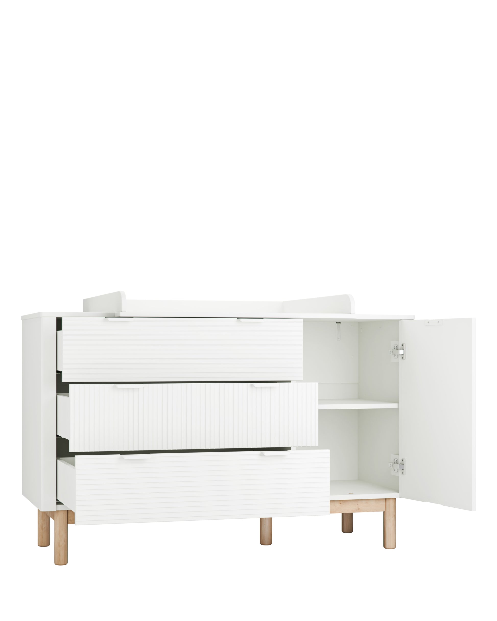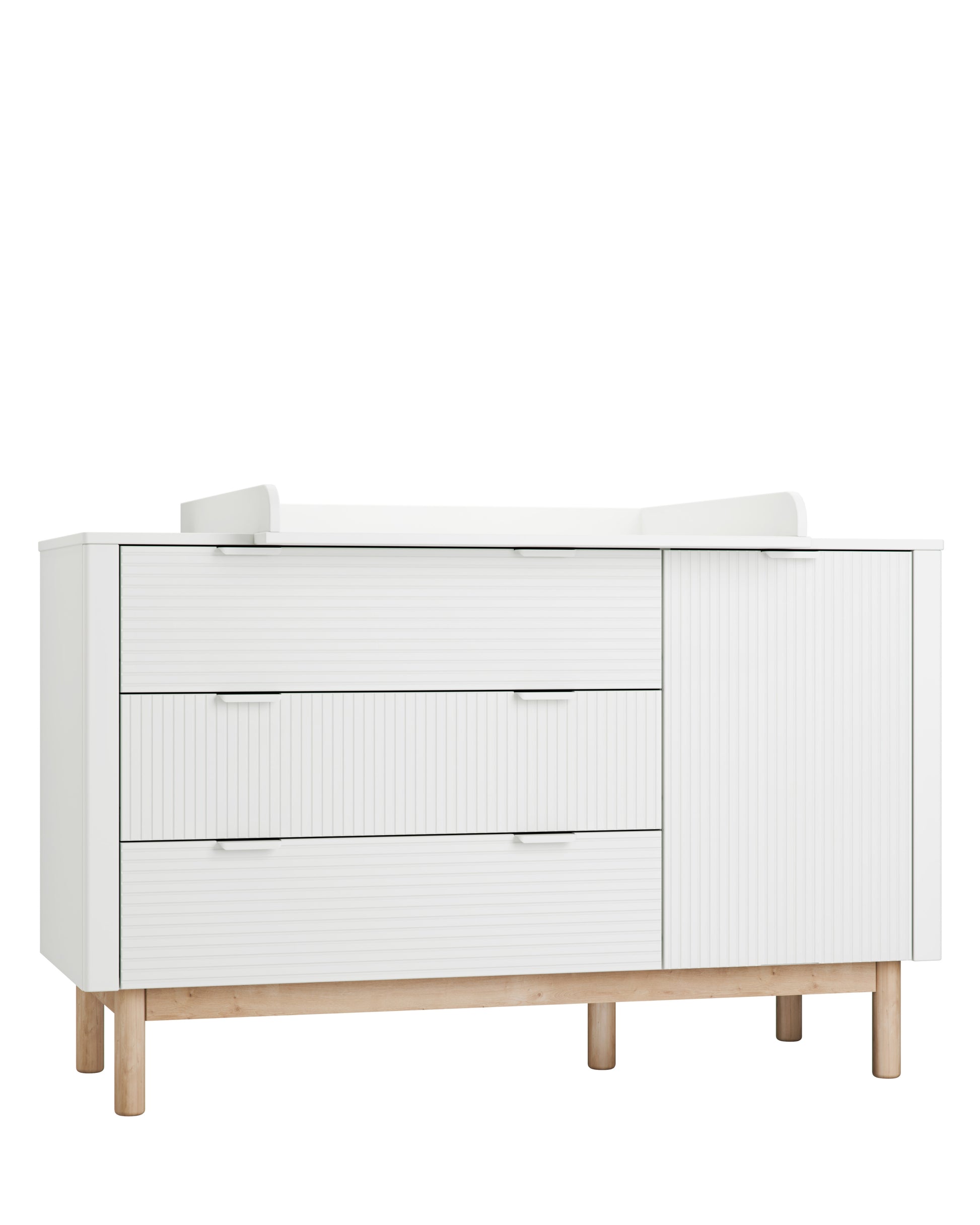 En elegant byrå från Miloo-serien, som är en perfekt förvaringslösning. Skåpdörren kan installeras på höger eller vänster sida. Alla dörrar och lådor har mjukstängning, tack vare vilken dörrar och lådor alltid stängs mjukt. Lätt rundade hörn säkerställer säkerheten för unga användare.