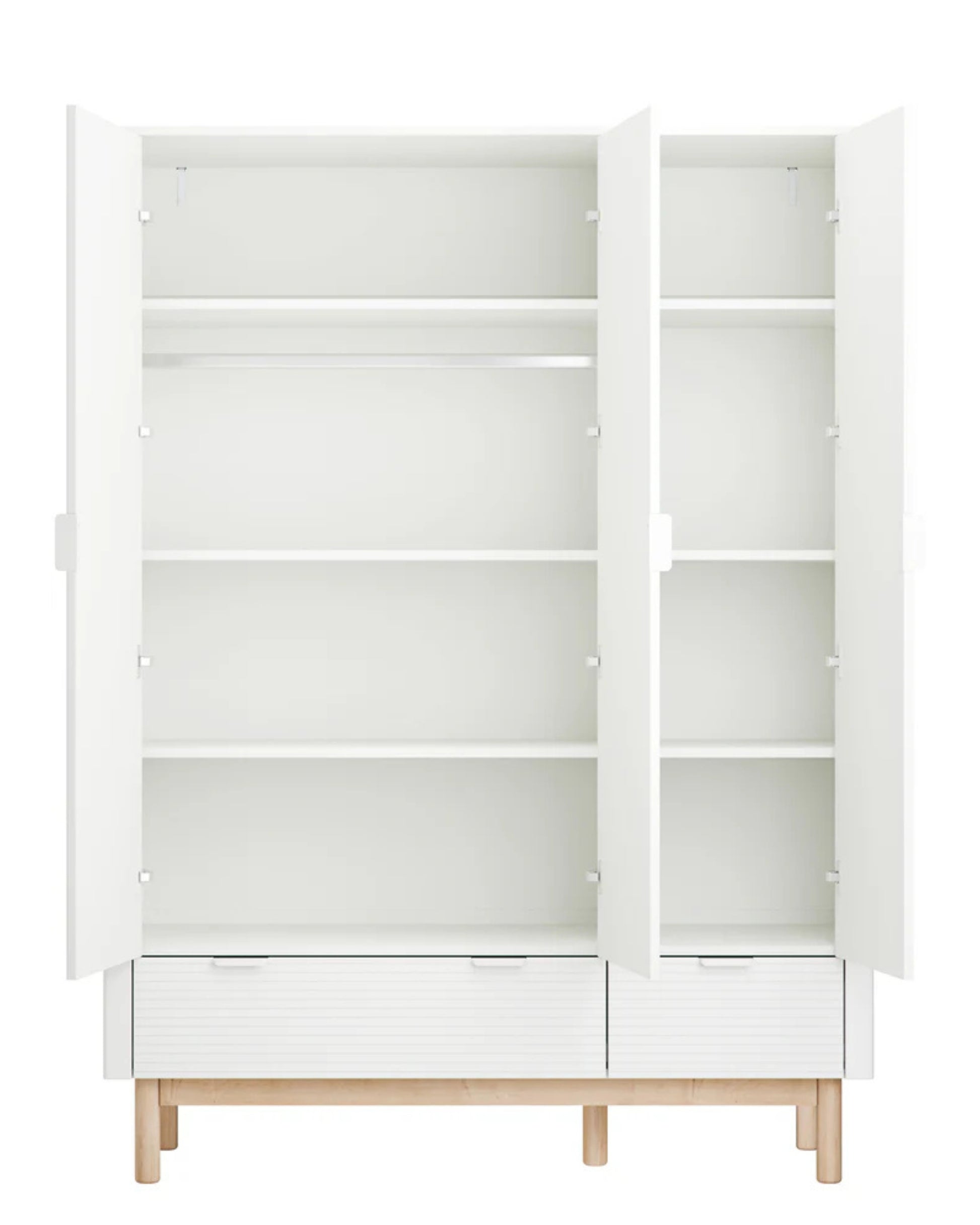 En elegant garderob från Miloo-serien. Alla dörrar och lådor har mjukstängning, vilket innebär att dörrar och lådor alltid stängs mjukt. Lätt rundade hörn säkerställer säkerheten för unga användare. Levereras som ett självmonteringspaket, vilket inkluderar alla delar och instruktioner som behövs för montering.