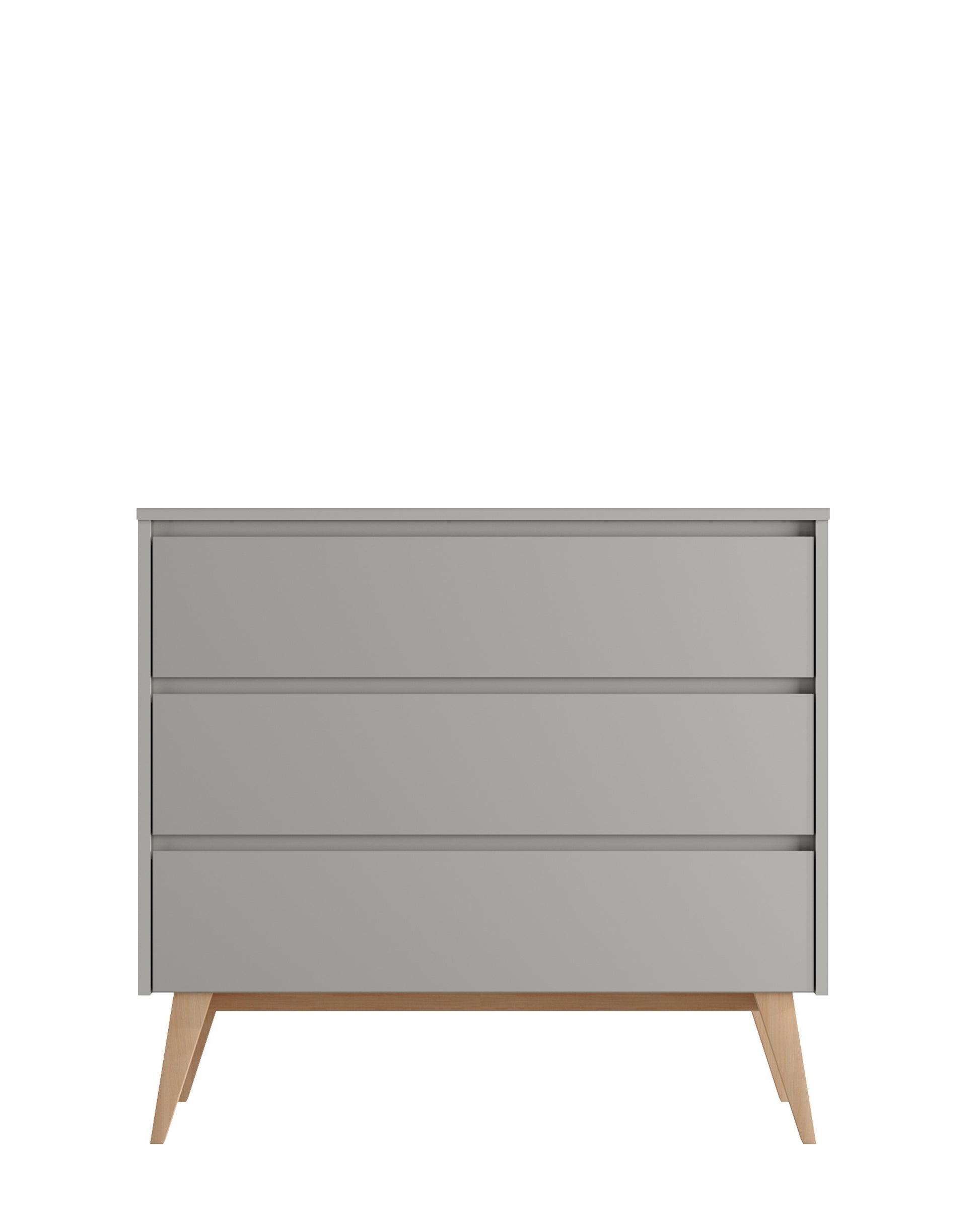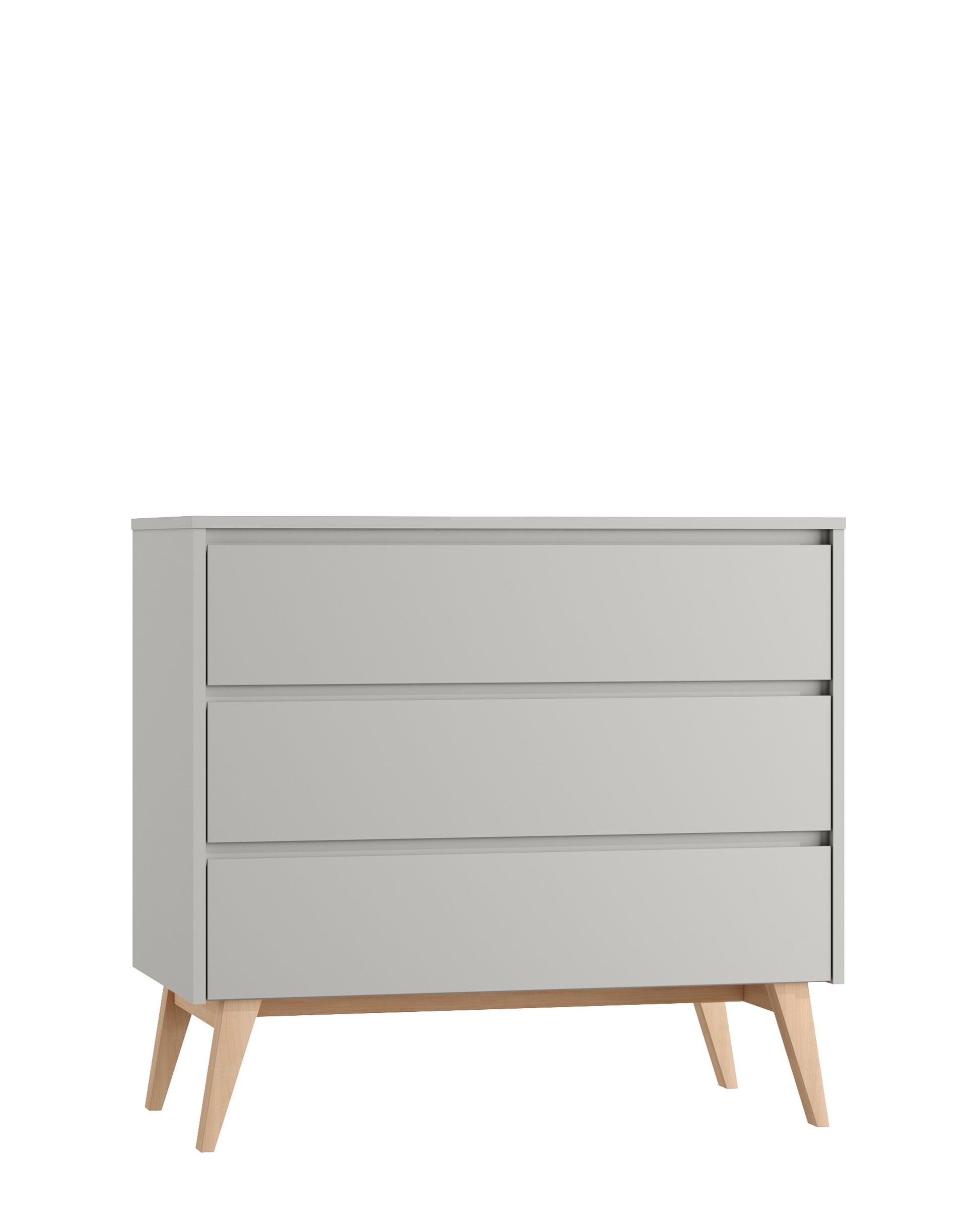 Den klassiska vita byrån erbjuder gott om förvaringsutrymme i tre lådor som glider smidigt på högkvalitativa skenor. Lådorna är utrustade med en praktisk självstängande funktion, vilket ökar bekvämligheten och säkerheten. En avtagbar skötbädd finns tillgänglig separat, vilket gör den till en mångsidig och hållbar möbel.