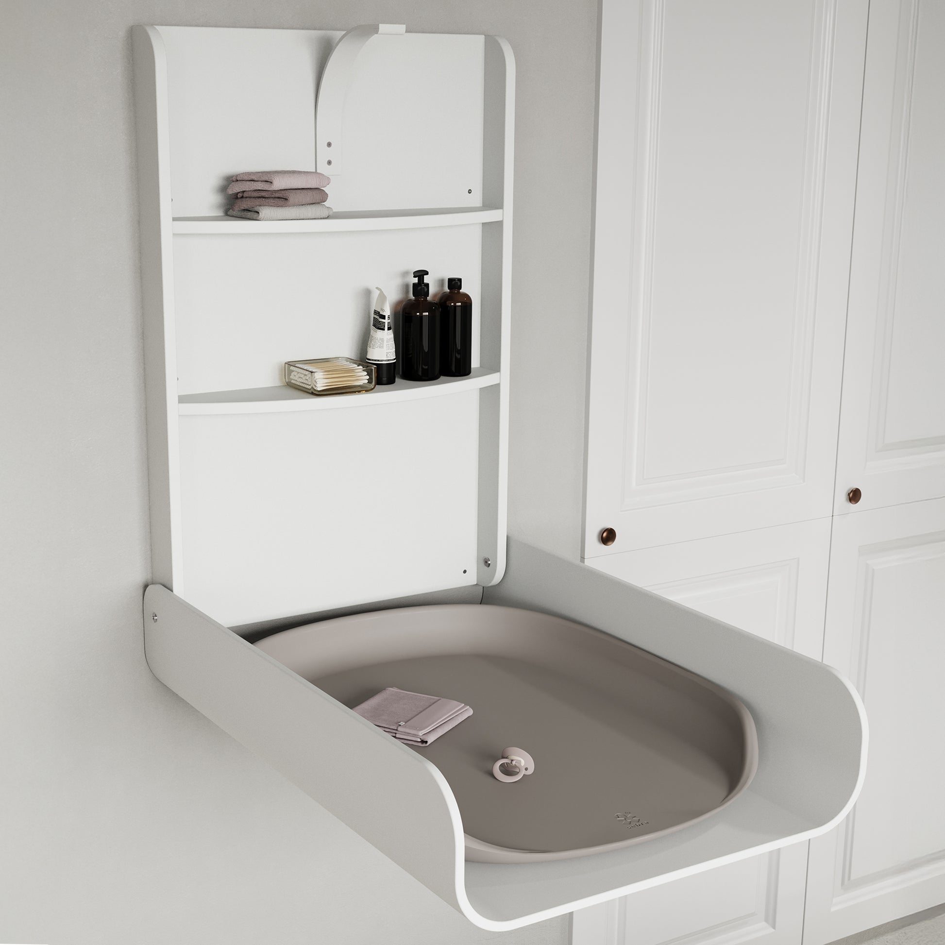 Seinään kiinnitettävä hoitopöytä on innovatiivinen ja tilaa säästävä ratkaisu kylpyhuoneeseen, makuuhuoneeseen tai muihin pieniin tiloihin, joissa tarvitaan toimiva hoitopaikka. Kevyen ja ilmavan muotoilunsa ansiosta hoitopöytä sulautuu saumattomasti moderniin sisustukseen – sekä avoimena että suljettuna.