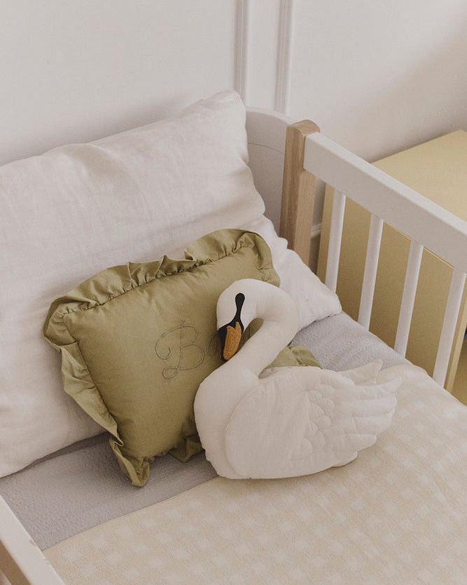 Lisää ripaus taikaa lapsesi huoneeseen meidän joutsen-tyynymme avulla. Tyynyssä on hienovaraisia mustia silkkipainettuja yksityiskohtia, ja oranssi nokka on kirjailtu ja hieman kohotettu tuomaan rakennetta. Ompeleet siivissä lisäävät luonnetta. Pieni ja kodikas, tämä tyyny sopii täydellisesti pinnasänkyyn ja tuo leikkisän yksityiskohdan.