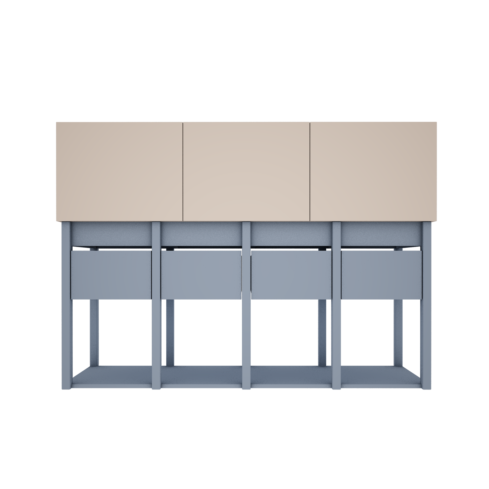 Tämä tyylikäs lipasto on täydellinen ratkaisu lastenhuoneen säilytystarpeisiin. Sen moderni värimaailma yhdistää lämpimän hiekanbeigen ja rauhallisen sinisen sävyt, jotka tuovat tilaan harmonisen ja ajattoman ilmeen.