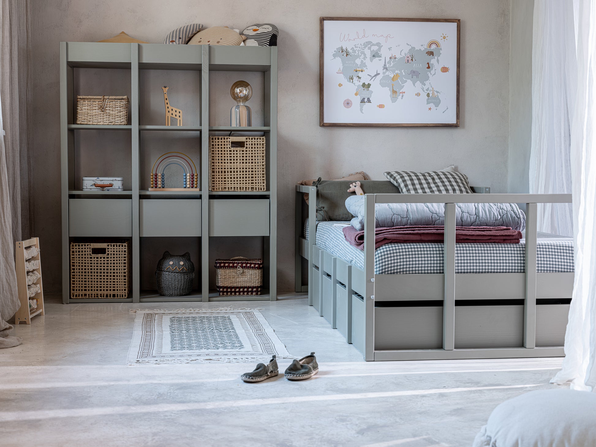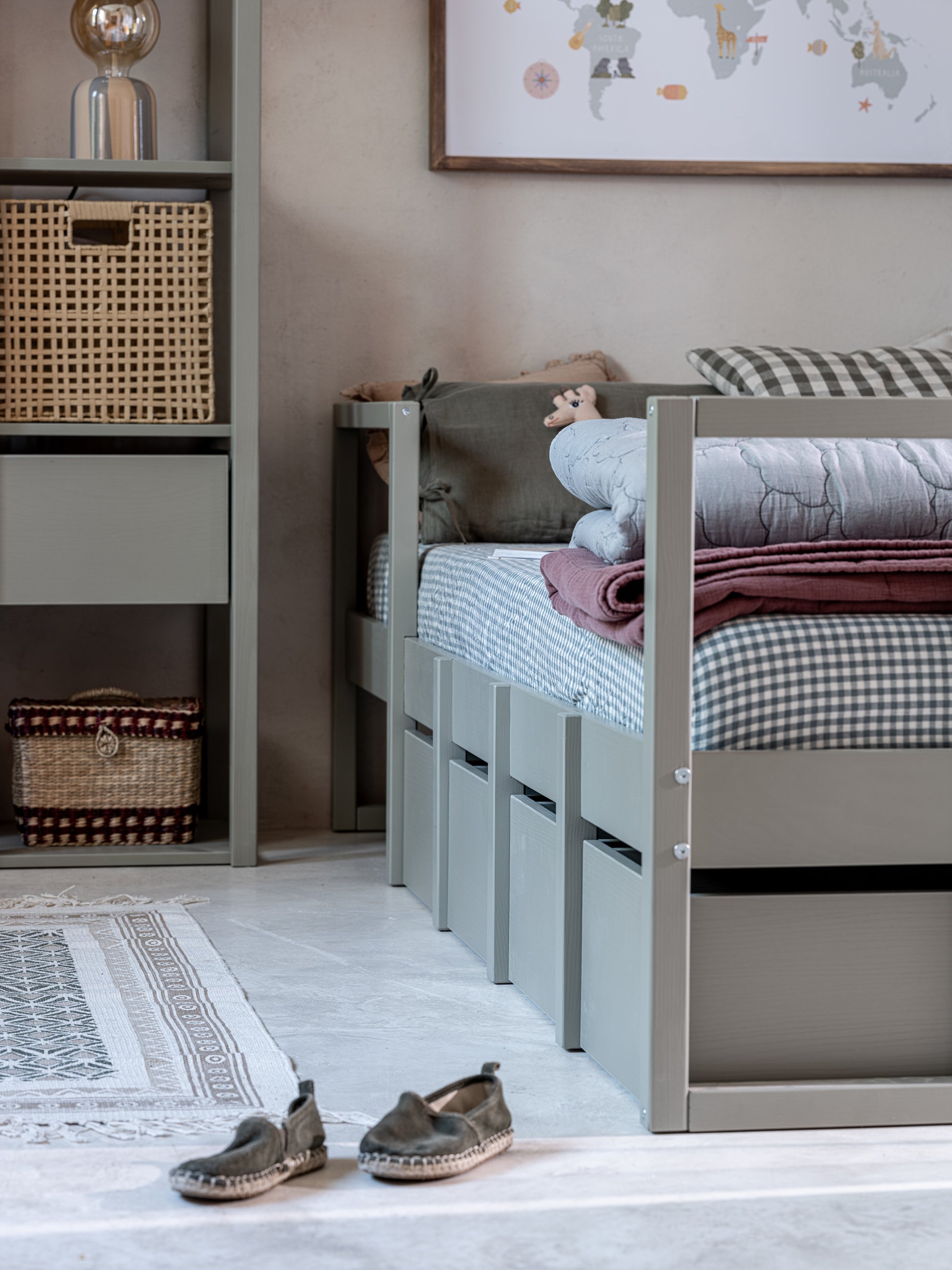 Här Modellen 90x200 cm har fyra lådor, vilket är perfekt för att förvara dina favoritleksaker. Den inbyggda hyllan ger extra bekvämlighet – perfekt för böcker, en lampa, en väckarklocka eller andra kvällsnödvändigheter som du vill ha nära till hands. Sängbotten är en flexibel ribbotten.