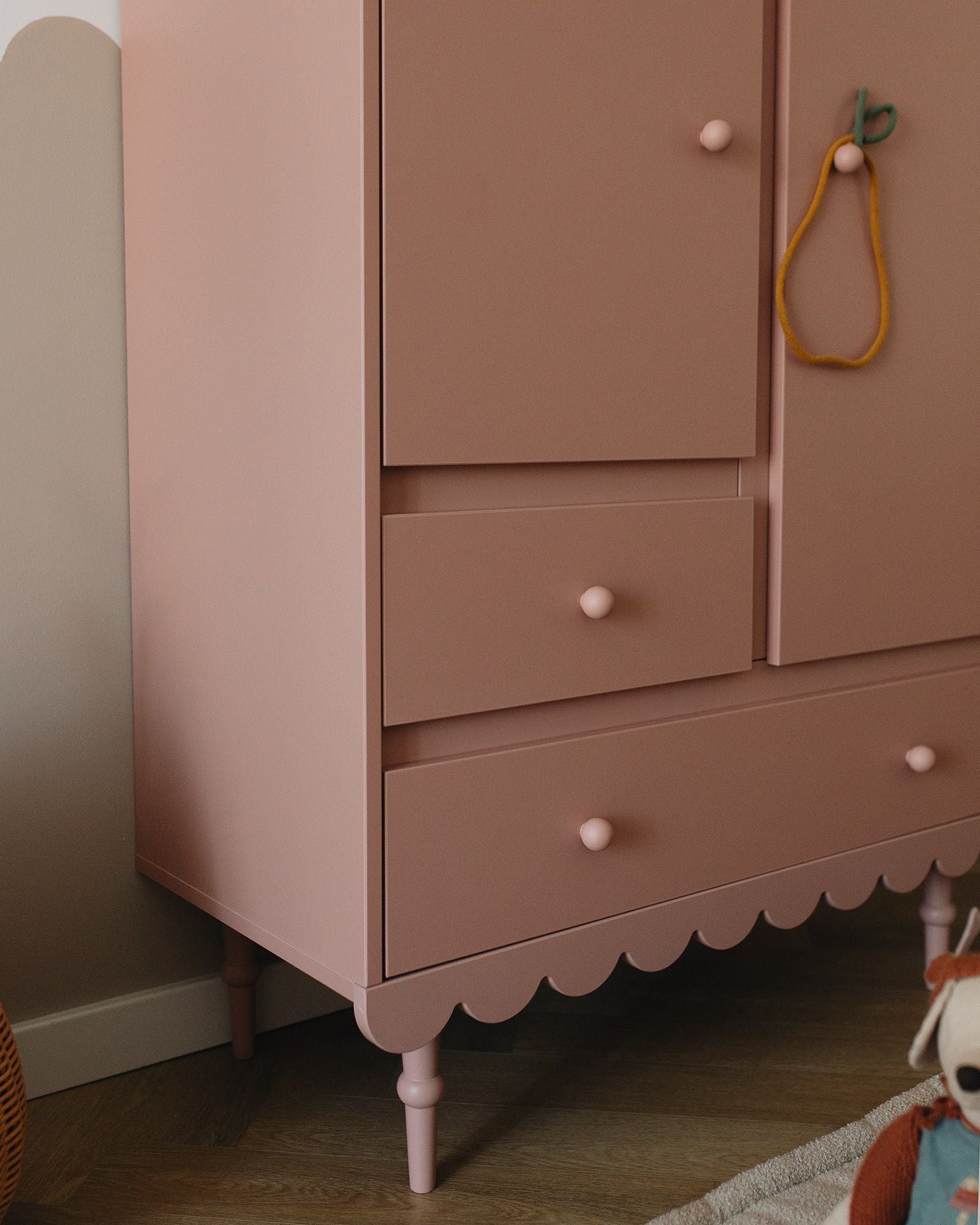 En fantastiskt vacker rosa garderob. Dess romantiska design passar harmoniskt in i både moderna och traditionella interiörer och ger dem en unik charm. Garderoben sticker ut med sin ursprungliga design, som den subtila volangen i botten, vilket ger den lätthet och charm.